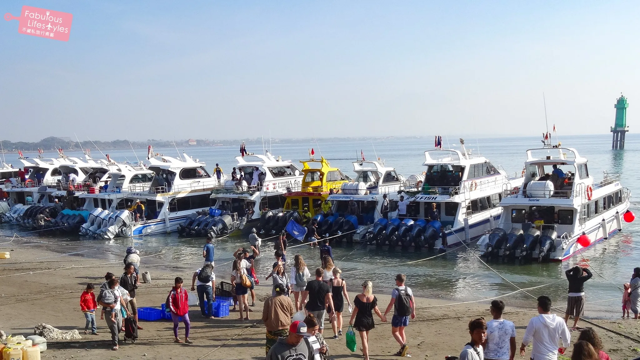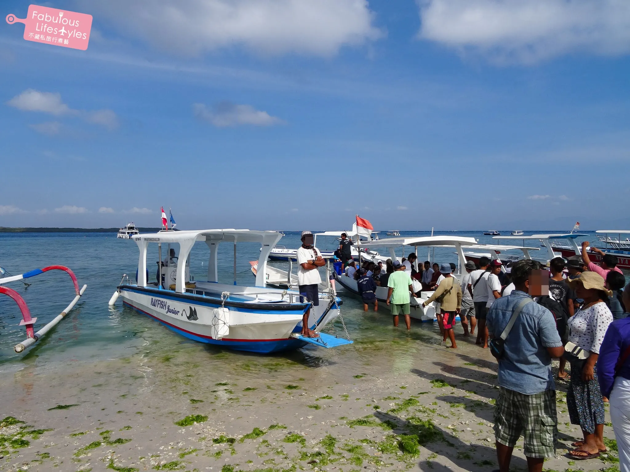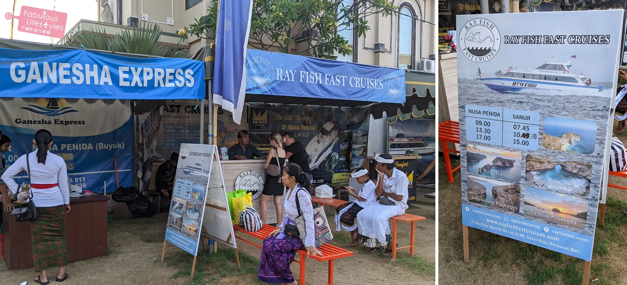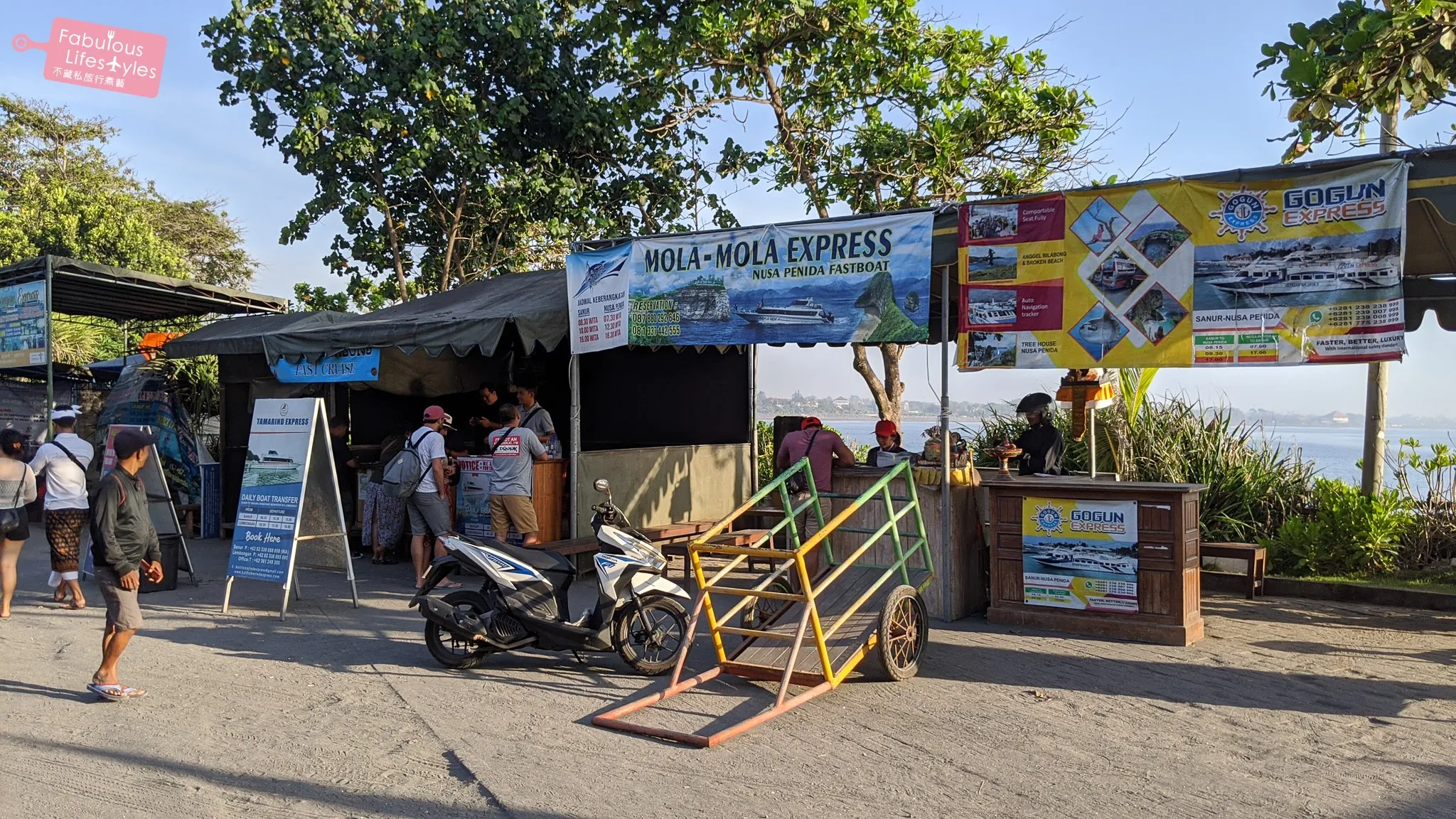 一大早司機先生就準時在飯店門口等我們,準時把我們載到沙努爾碼頭,並細心地跟我們約好回程等我們的地點。在碼頭有另一個工作人員將船票遞給我們,並說明回程船票要怎麼處理以及幾點需要回到櫃台集合等等的資訊。我們往返珀尼達島搭乘的是這家 Ray Fish Fast Cruises 的快艇。每天有三班船來回珀尼達島,我們搭的是早上 7:45 分出發的船,是不是真的得有夠早起的!?