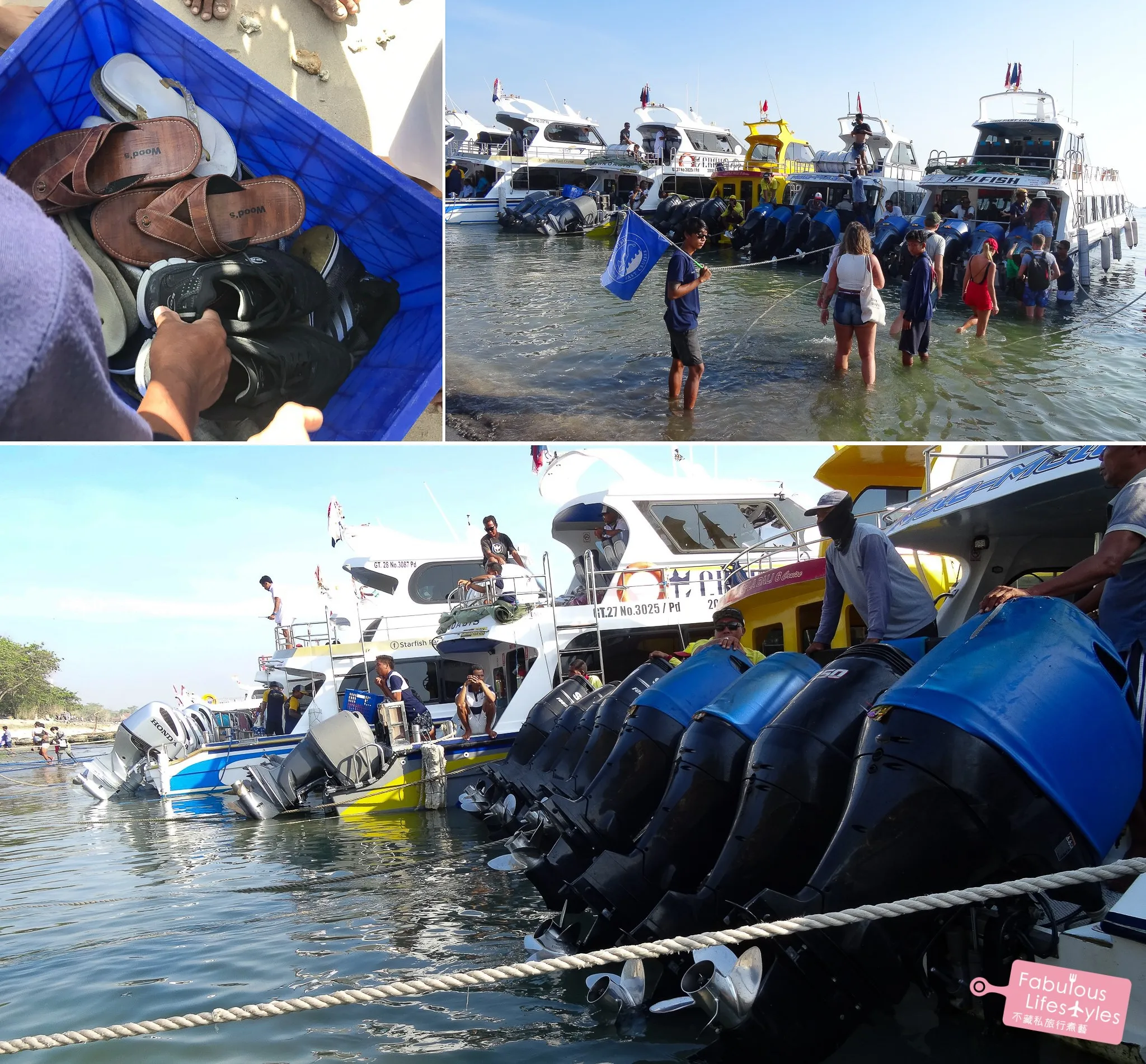 所有人上船前都得把鞋子脫掉放在塑膠箱裡,穿水鞋也不行,必須赤腳上船。應該是快艇公司怕大家的鞋子把海灘上的沙帶進船裡不好清吧!?上船時的渉的水比想像中還要深~每艘快艇後面都有四顆超巨大的馬達,我們還第一次看到這種款式!