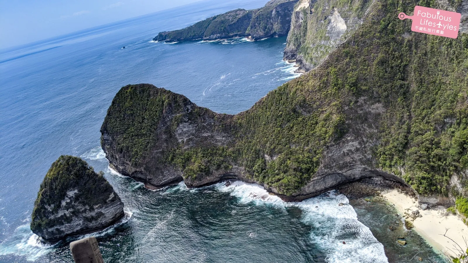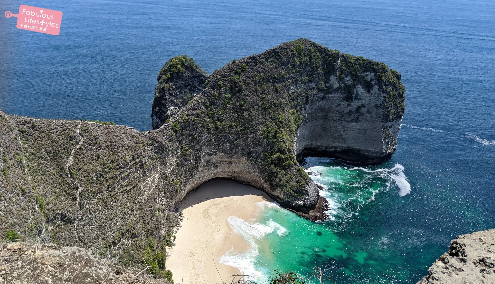 終於來到一日遊最主要的景點:看的到暴龍的 Kelingking 海灘(又名:精靈墜崖)。狹長的山脊綿延伸入大海,形狀好似侏儸紀公園裡的暴龍 🦖,周圍被遼闊浩瀚的大海環繞。酷似暴龍形狀的山壁,中間包圍著潔白的沙灘,碧綠的海水,若隱若現的珊瑚礁,以及隨著陣陣海浪激起的白色浪花!從上俯瞰而下,儼然一幅美到令人窒息的景象!能夠在已經非常成熟的峇里島景點中,瞬間爆紅~果真有其超凡的魅力!