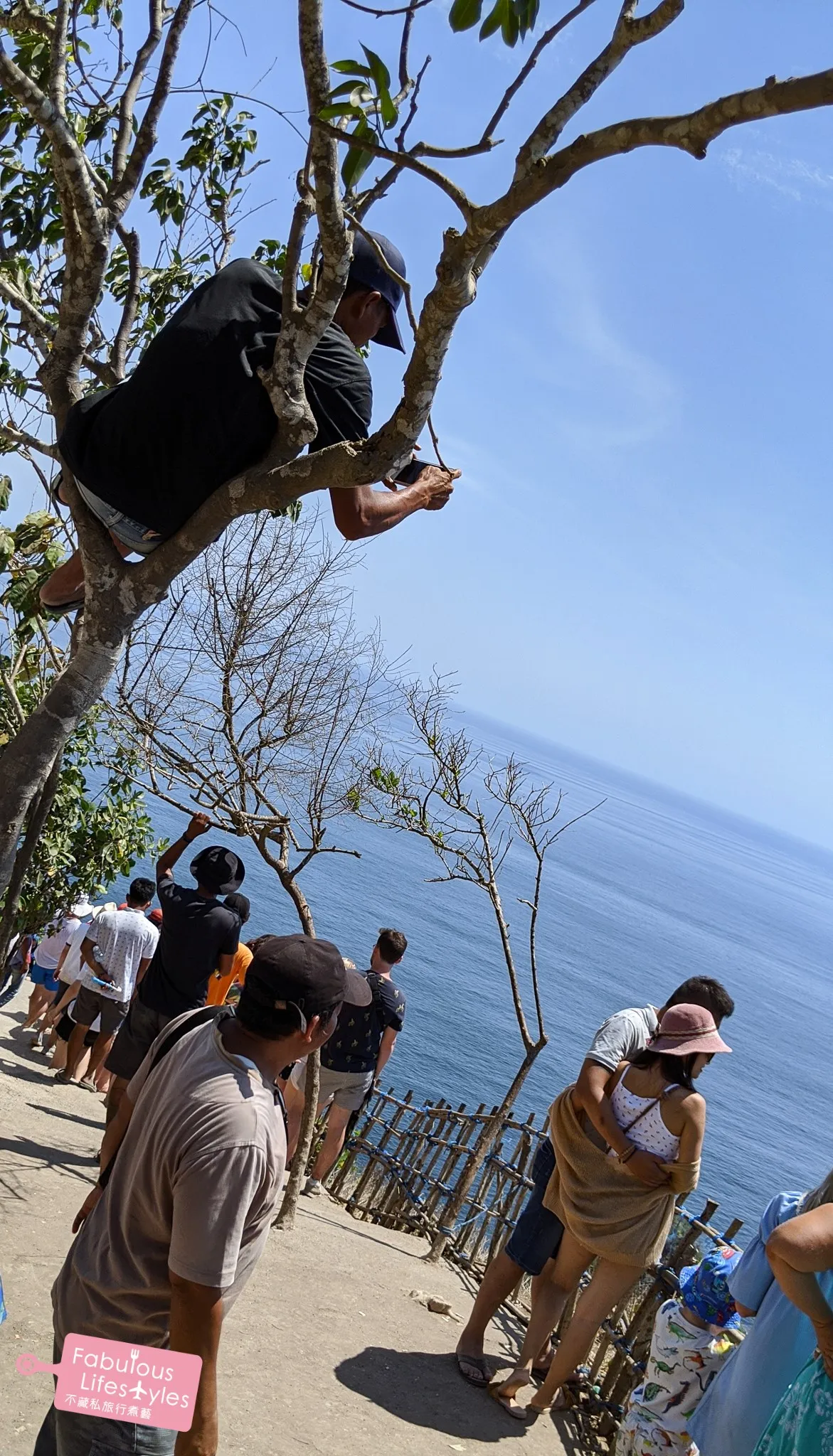 順便分享一下另一個相對比較安全的跟暴龍合照方式~俗話說,每位成功的網美,背後一定有一個偉大的攝影師(😆這句話怎麼好像怪怪的)。Kelingking 海灘還真的隨處可見攝影師的偉大,為了拍出美照,爬樹只是一塊小蛋糕 🍰 而已!!!