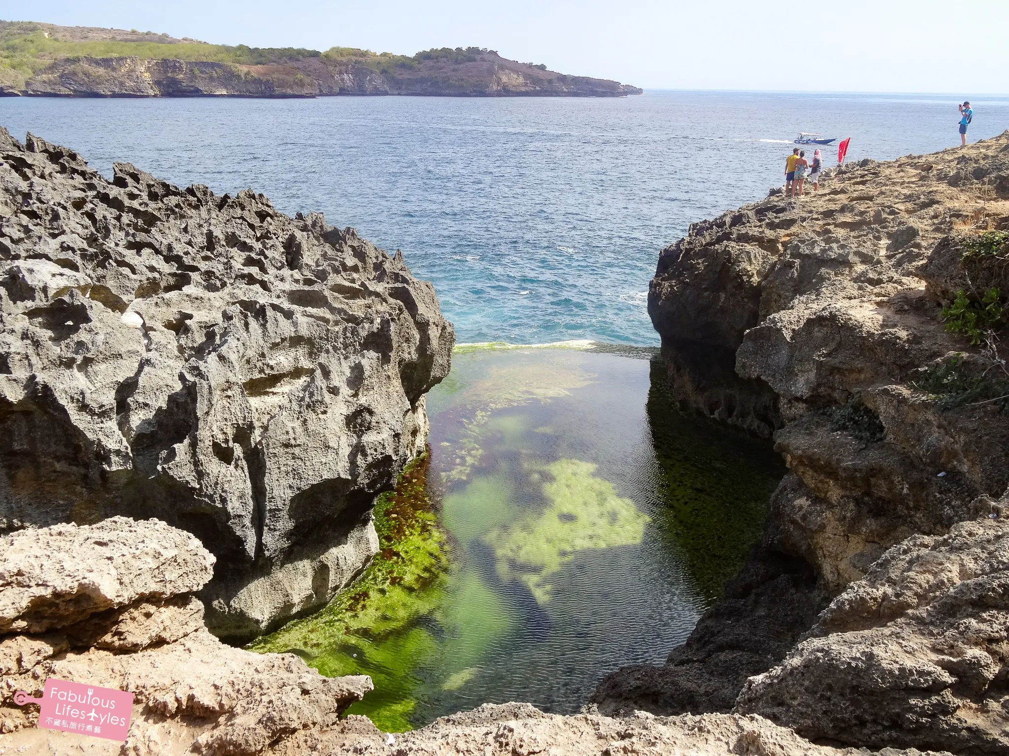 距離 Kelingking 海灘不到 30 分鐘車程的天使浴池(又名天神浴池/神仙浴池),這個由火山岩天然形成的無邊際泳池,碧綠色的天使浴池連接著池外湛藍的壯闊大海,浴池內海水平面如靜,僅僅一線之隔外面則是滔滔海浪,形成一個十分神奇罕見的景色~