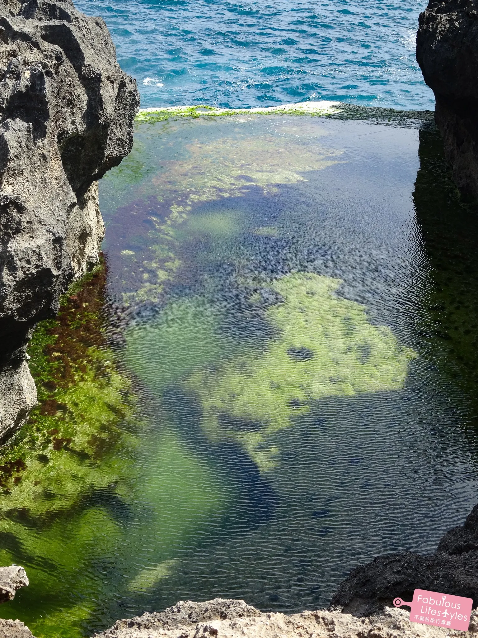 碧綠色的海水下映著不規則形狀的火山岩,十分特別~