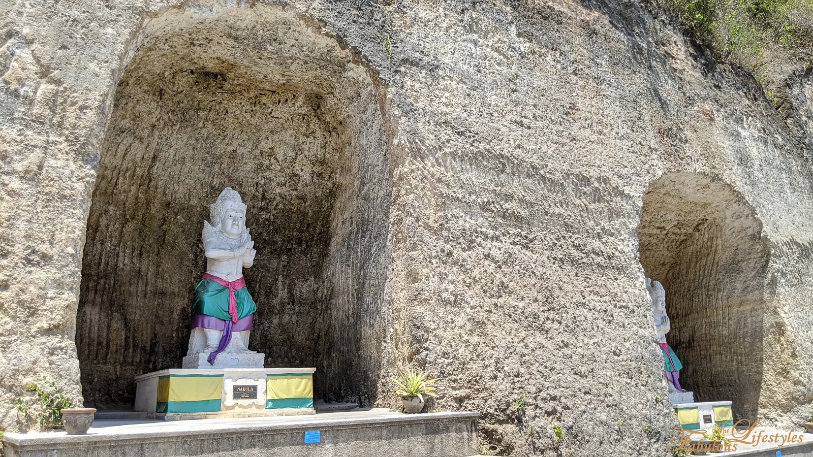 What really gives you that instant "Wow, I'm in Bali" feeling are the majestic white statues nestled inside carved-out caves along the cliff face. Every single one is draped in incredibly detailed, traditional Balinese attire~ ☺️