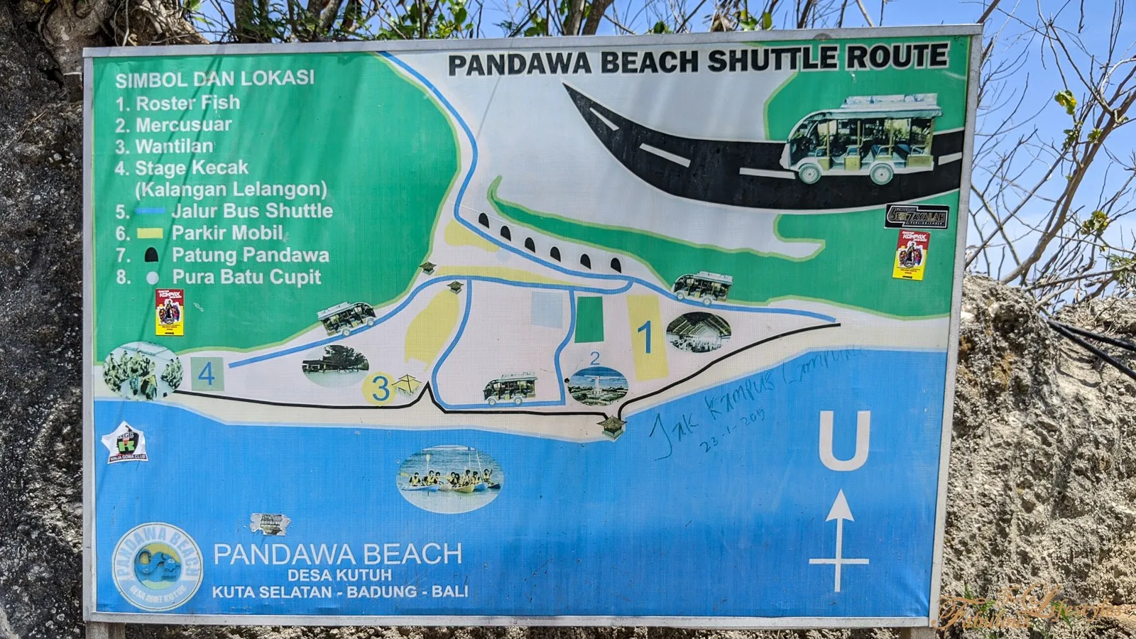 Since we took the hotel's shuttle bus down to Pandawa Beach, we didn't have to figure out the public transport. However, we did notice a lot of people riding these sightseeing shuttle buses along the cliff side (we aren't sure if they require a fee). There was a clear street sign next to it listing all the shuttle stops. It honestly looks pretty convenient!