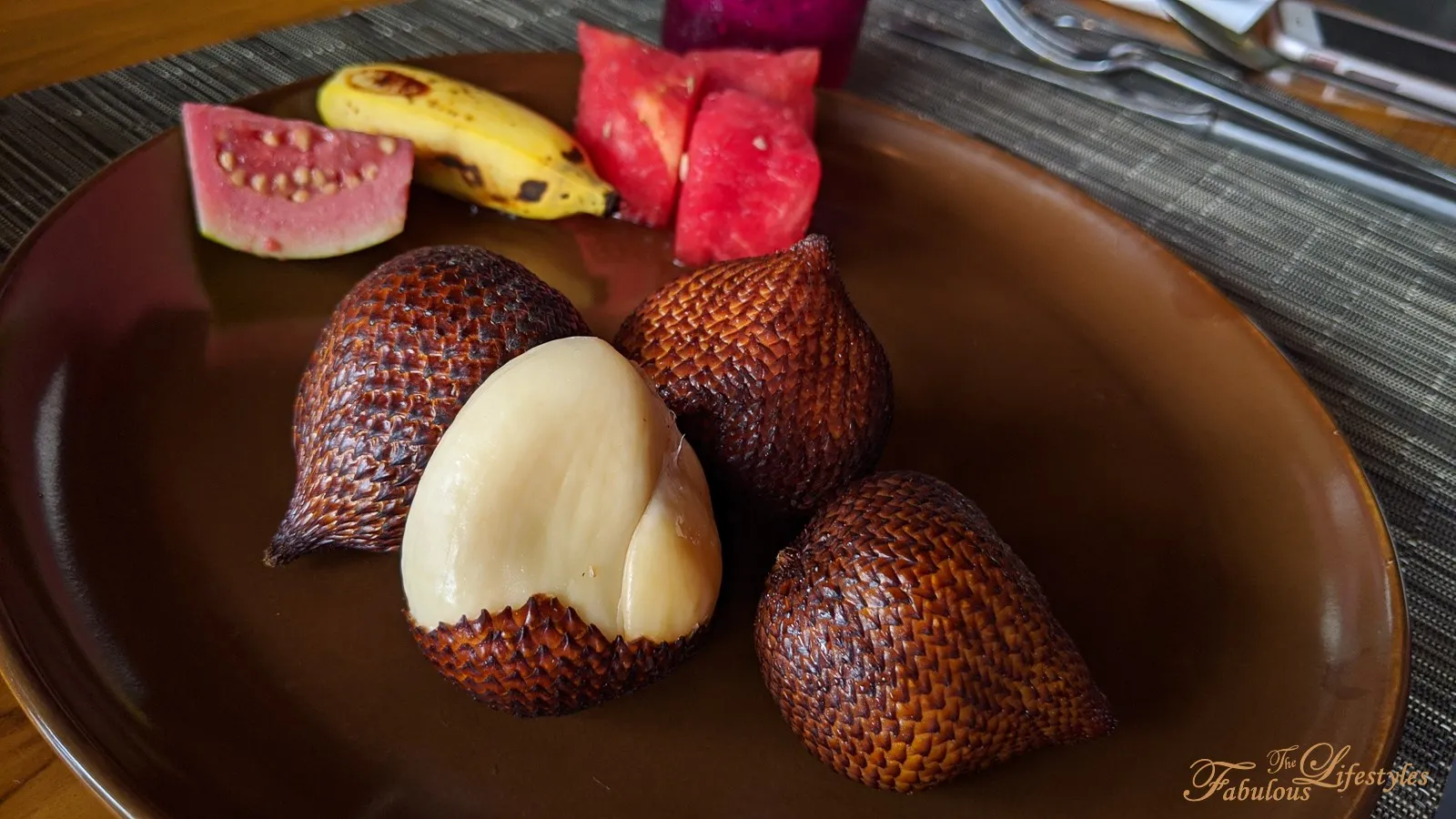 This even includes Salak (snake fruit), which we had never seen before! We actually had to ask the staff, "How do you peel this?" just to get it open 😆. The outer skin has little scales and truly looks exactly like snake skin! Salak tastes slightly tart and isn't very sweet, but it has a distinct fruity aroma. The flavor is definitely an acquired taste. We weren't big fans on the first bite, but after trying a couple more, the taste totally grew on us!