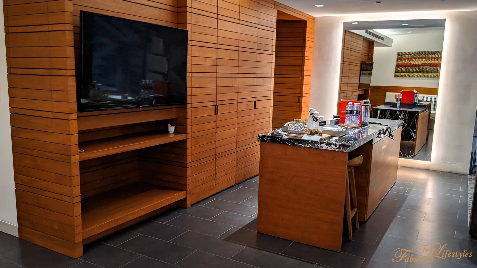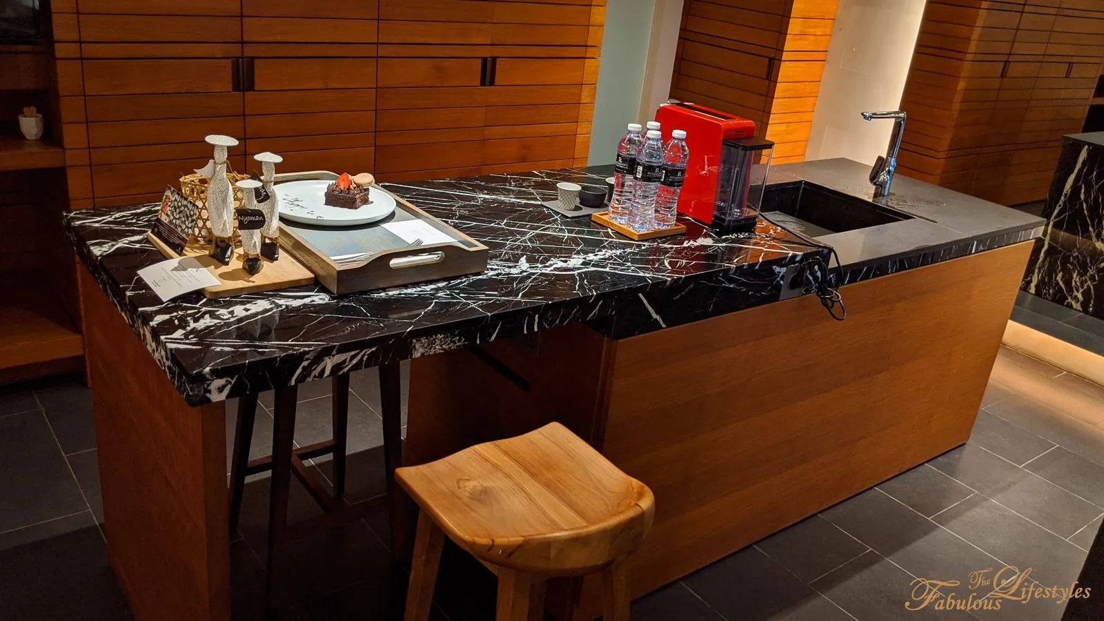 Right in the center of the room is an oversized kitchen island, which is quite rare for hotels! This island design is incredibly practical. In many hotels, if you want to wash a cup or some utensils, you have to do it in the bathroom sink because that's where the only faucet is. The faucet built right into this suite's island solves that problem completely~
