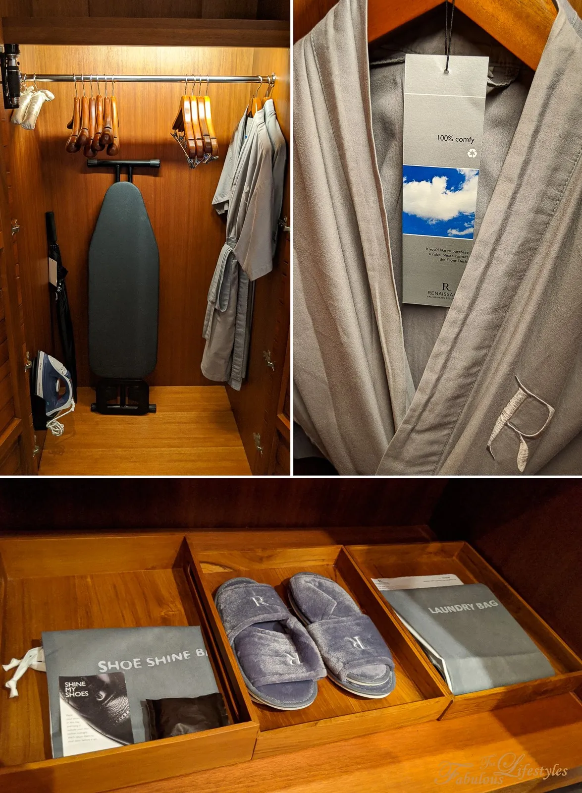 Inside the wardrobe, you'll find everything you need: bathrobes, slippers, umbrellas, an iron, and an ironing board! Speaking of which, I absolutely have to give a special shoutout to the bathrobes! Cherry has worn many hotel bathrobes, including plenty of comfortable ones, but this one remains unforgettable!!! It totally lives up to the "100% comfy" tag—it is seriously so comfortable! The issue with many hotel robes is that even if the material is nice, they often feel mismatched with the room's temperature, ending up too hot or too heavy. This robe, however, is incredibly soft, with just the right thickness so it feels light and completely unburdensome. Cherry heavily regrets not buying one to take home!