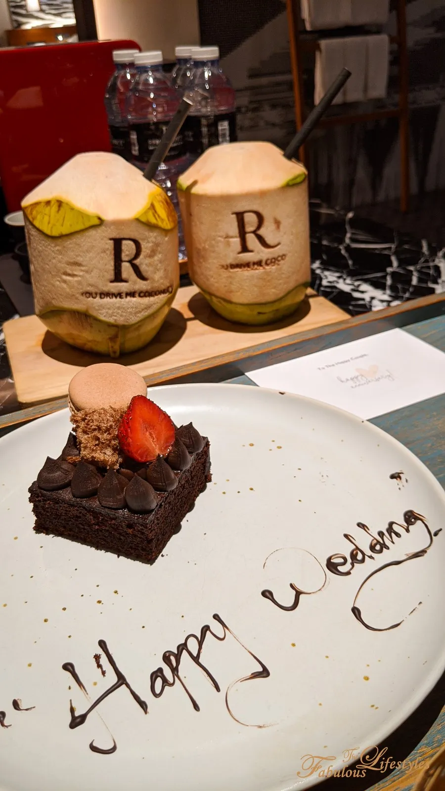 To celebrate our wedding anniversary, they even included a brownie and macarons~ The front desk staff had originally told us our selected welcome drinks were non-alcoholic, but upon realizing they actually contained alcohol, they quickly called our room to apologize and sent up two fresh coconuts to replace them!