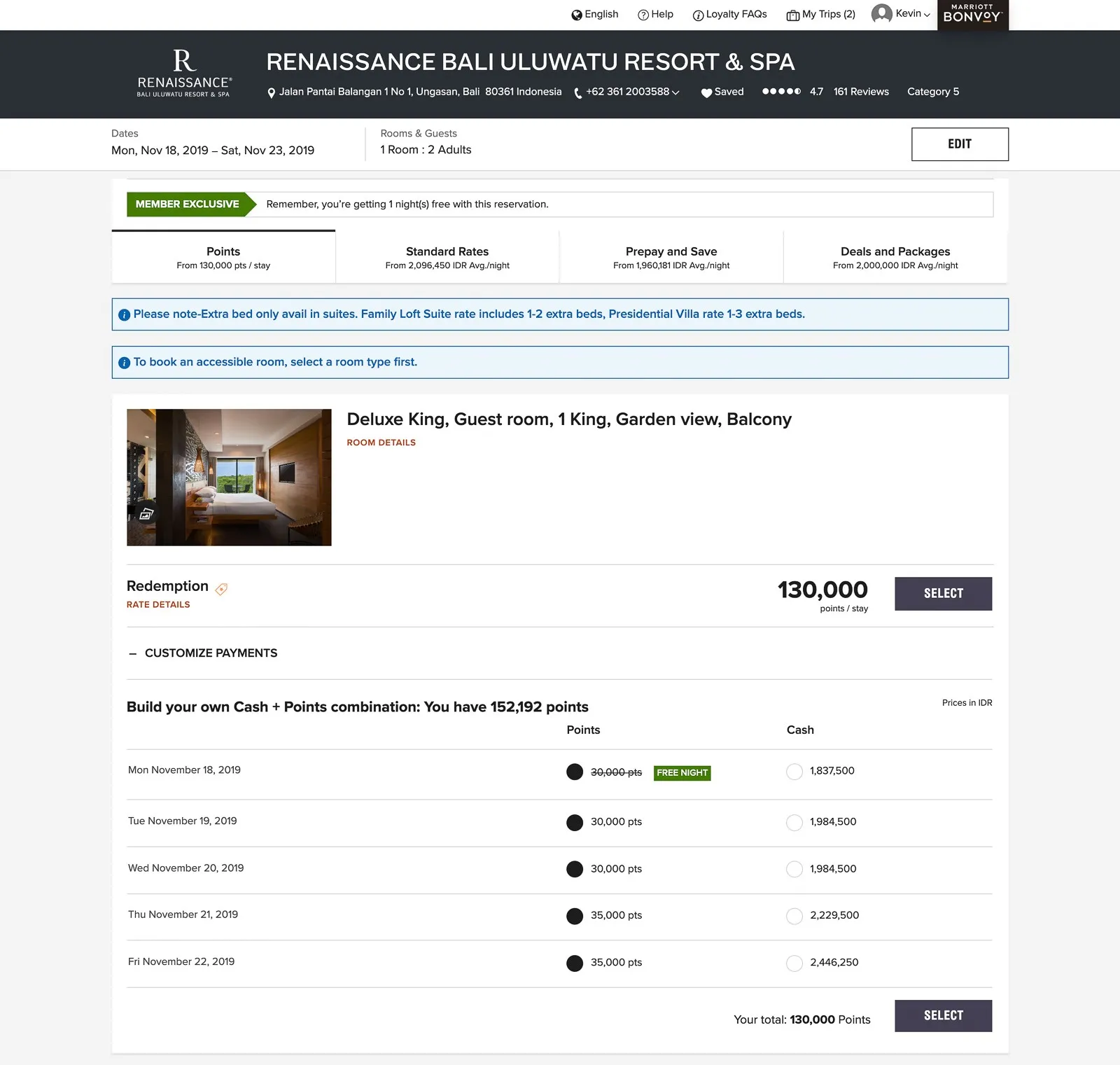 We chose to visit in November — technically Bali's rainy season — though we didn't encounter a single drop of rain! Here's how the point costs varied day by day that month: