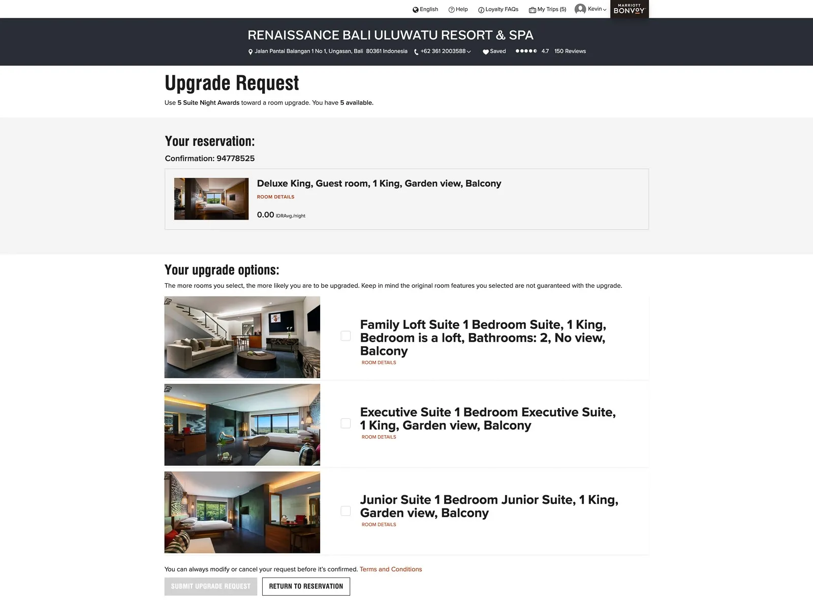 We had previously chosen the Five Suite Night Awards as our Choice Benefit, which turned out to be a perfect match for this five-night Bali booking! As you can see in the suite upgrade screen below, there are several room types to choose from. You can select multiple preferred upgrades, but keep in mind that upgrades aren't guaranteed — you'll only find out if you've been confirmed a few days before check-in.