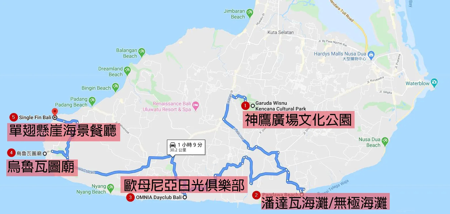 The Uluwatu coastline is blessed with dramatic, towering cliffs. Because it faces west, the golden glow of the setting sun dances across the endless ocean, weaving together with the steep cliffs to create a breathtakingly beautiful natural landscape. Since Uluwatu Temple is situated at the very, very southwestern edge of Bali, it’s a bit of a drive from the island's other major tourist hubs. It would be such a pity to travel all that way just for the temple! So, Cherry has thoughtfully put together a route-optimized map of all the must-visit spots in the area to make the most of your journey 👇🏻