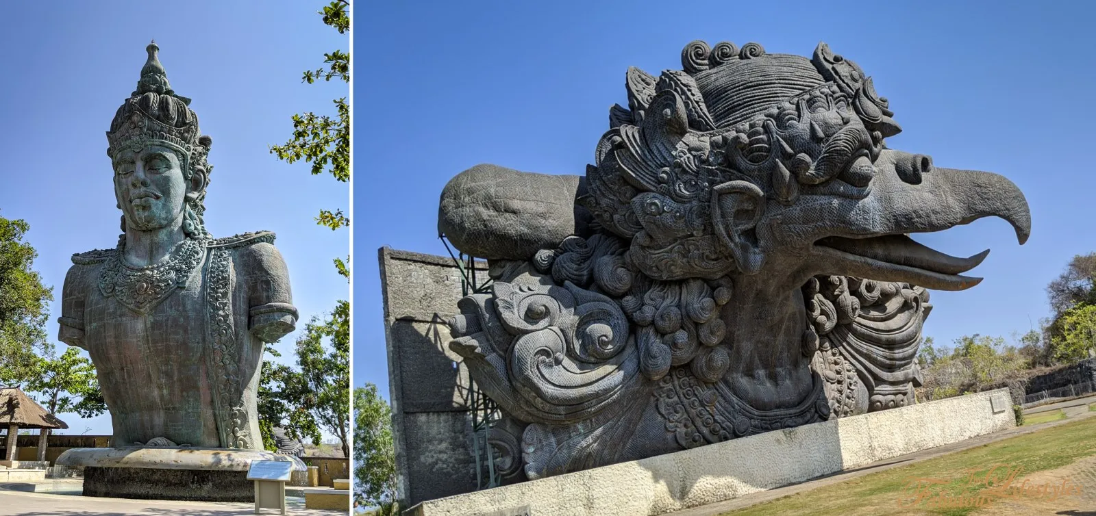 The majestic Garuda Wisnu Kencana (GWK) statue, which took a staggering 28 years to build, stands out prominently within the Garuda Wisnu Kencana Cultural Park in Uluwatu. After the park's second phase was completed in 2018, this 122-meter-tall masterpiece became not only the tallest statue in Indonesia but also the fourth tallest in the world (as of Nov 2019)—it's even taller than the Statue of Liberty in New York 🗽 and Christ the Redeemer in Brazil! The story behind this colossal monument comes from Balinese Hinduism. It depicts Lord Wisnu (Vishnu), the symbol of wisdom and protection, riding his mount Garuda, a mythical eagle representing loyalty and selfless devotion. Many of Bali's most famous attractions are deeply rooted in Hindu culture, and this monumental statue is a magnificent example of that.