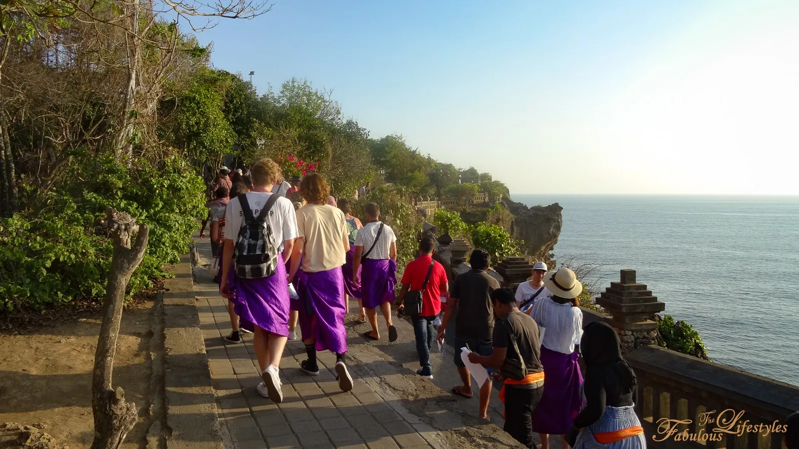 The sarongs provided by this temple are purple, paired with bright orange sashes.