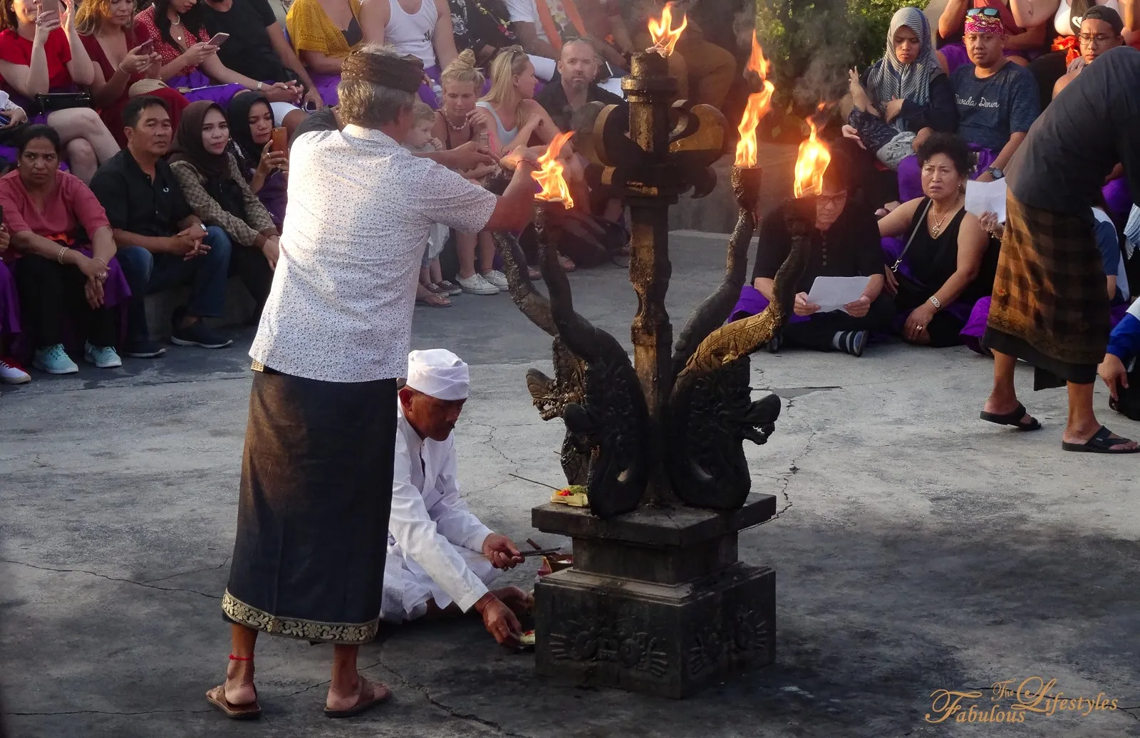 Right before the performance begins, someone comes out to light the bonfire in the center of the stage.