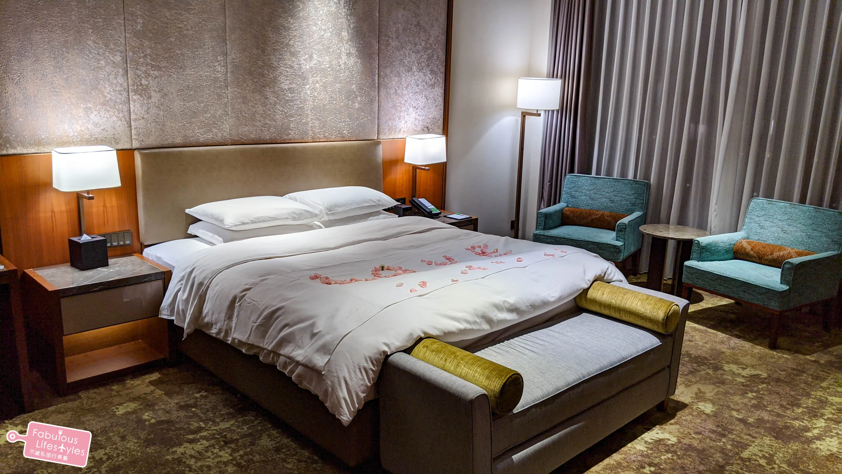 The bed was beautifully decorated with petals—a thoughtful touch by the hotel. There’s also a cozy seating area with two chairs right next to the bed~