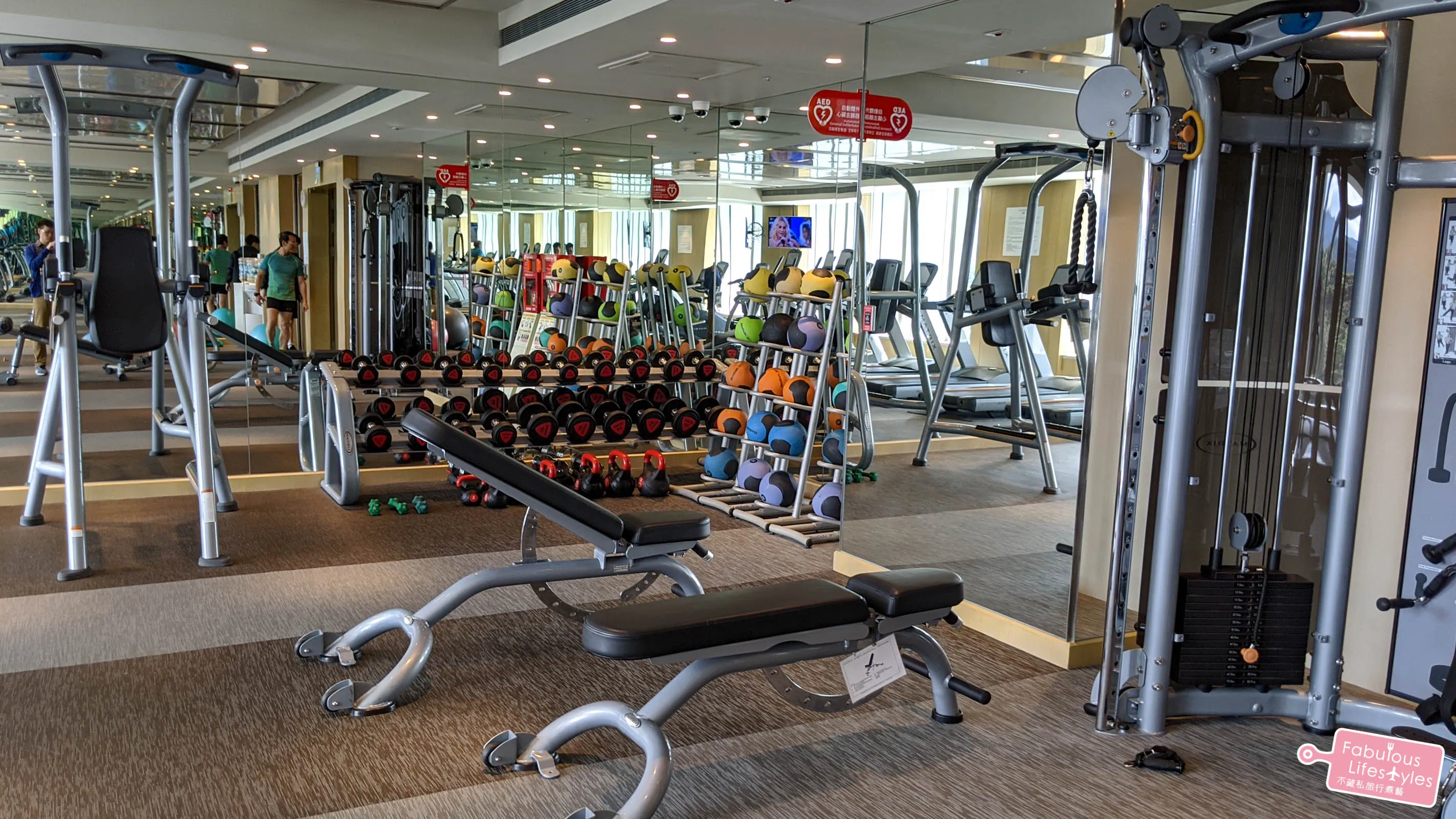 The fitness center is fully equipped with treadmills, walking pads, spin bikes, dumbbells, and weight training equipment.
