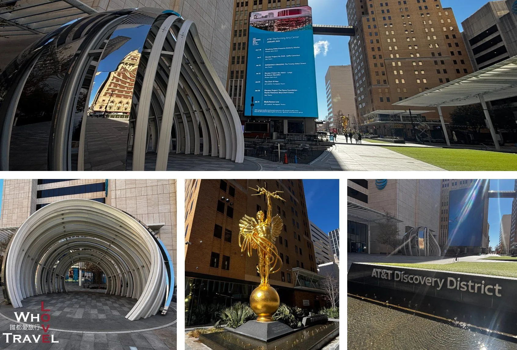 Located right in the heart of downtown Dallas, the AT&T Discovery District was born in 2008 when the telecom giant bought several adjacent skyscrapers to form their global headquarters. In 2018, they invested $100 million to transform the surrounding four blocks into an incredible space bridging tech, art, and food, aiming to bring young talent back to the city center. The biggest draw is the massive 9,000-square-foot high-res Media Wall that changes themes based on holidays, sports (like Dallas Mavericks games!), or digital art features. In the center of the plaza sits a giant mirrored structure known as "The Globe," which reflects the surrounding skyscrapers and houses 300,000 LED lights for interactive light and sound displays. On the other side, there's a stunning golden replica of AT&T’s historic "Spirit of Communication" statue. Beyond the tech and art, it's an incredible food hub with a two-story food hall featuring 13 different restaurants and 2 bars. Paired with free high-speed Wi-Fi across the plaza, it’s the absolute perfect spot to rest, grab a bite, edit photos, check your map, and knock out a sightseeing spot all at once!