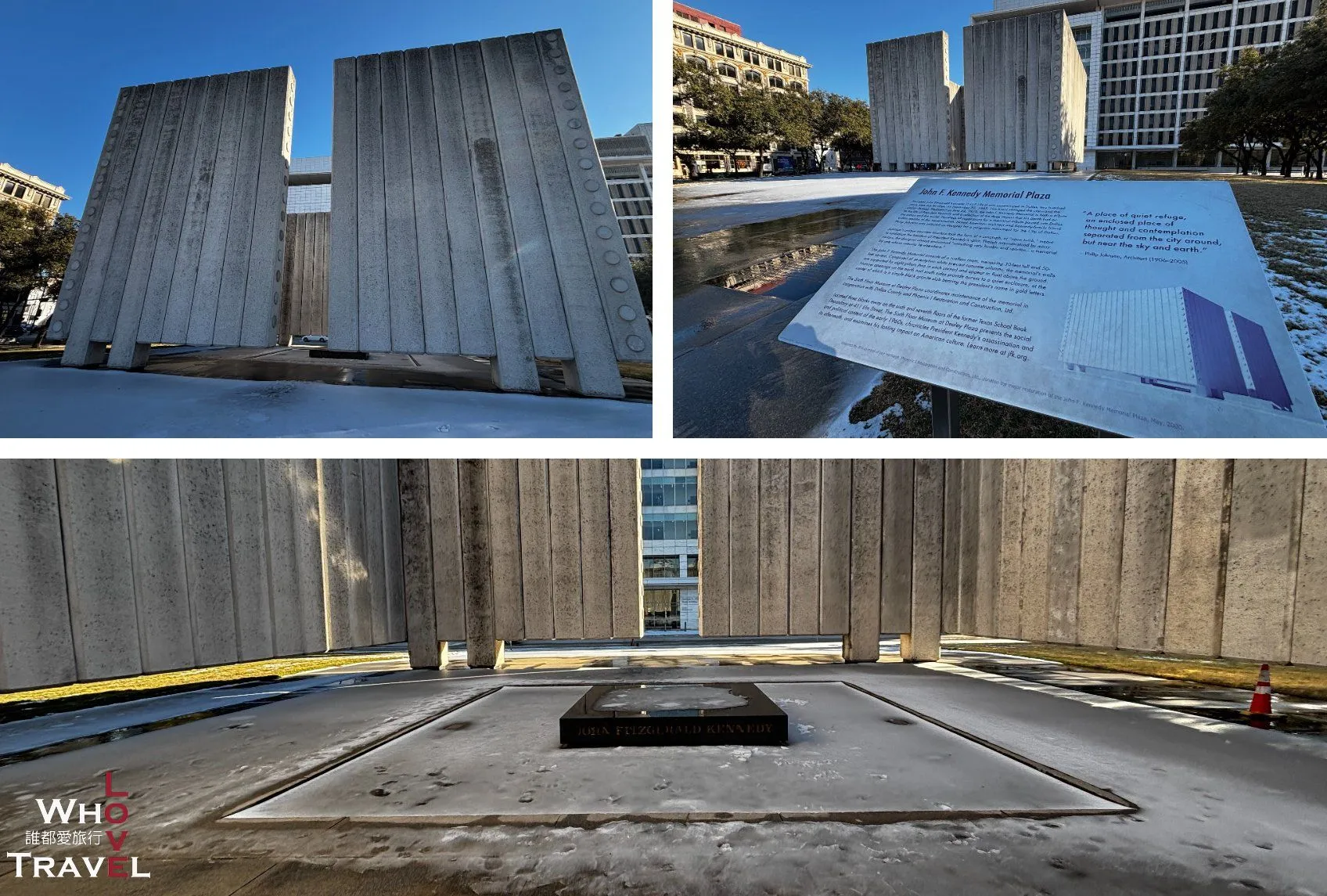 Designed by the legendary architect and first-ever Pritzker Prize winner Philip Johnson, this 'cenotaph' (empty tomb) is a roofless, square structure that seems to hover above the ground. Formed by 72 white concrete columns, it was designed to look as if it's floating, symbolizing the 'spirit of freedom' President Kennedy pursued in his lifetime. Inside, the center holds nothing but a single block of black granite with Kennedy's name carved in gold leaf. There's no long biographical plaque. Stepping into this enclosed yet airy space, you'll find the noise of the bustling city traffic instantly fades away. The designer intended this to be a place for quiet reflection on Kennedy's life, philosophy, and ideals. It's a stark contrast to what you might imagine a traditional memorial looks like, brilliantly executing 'minimalism' and 'spatial awareness'. It's just a short 4-minute walk from the Sixth Floor Museum. After visiting the site of the assassination, we highly recommend taking a walk over to experience the tranquil and solemn atmosphere of this memorial space.