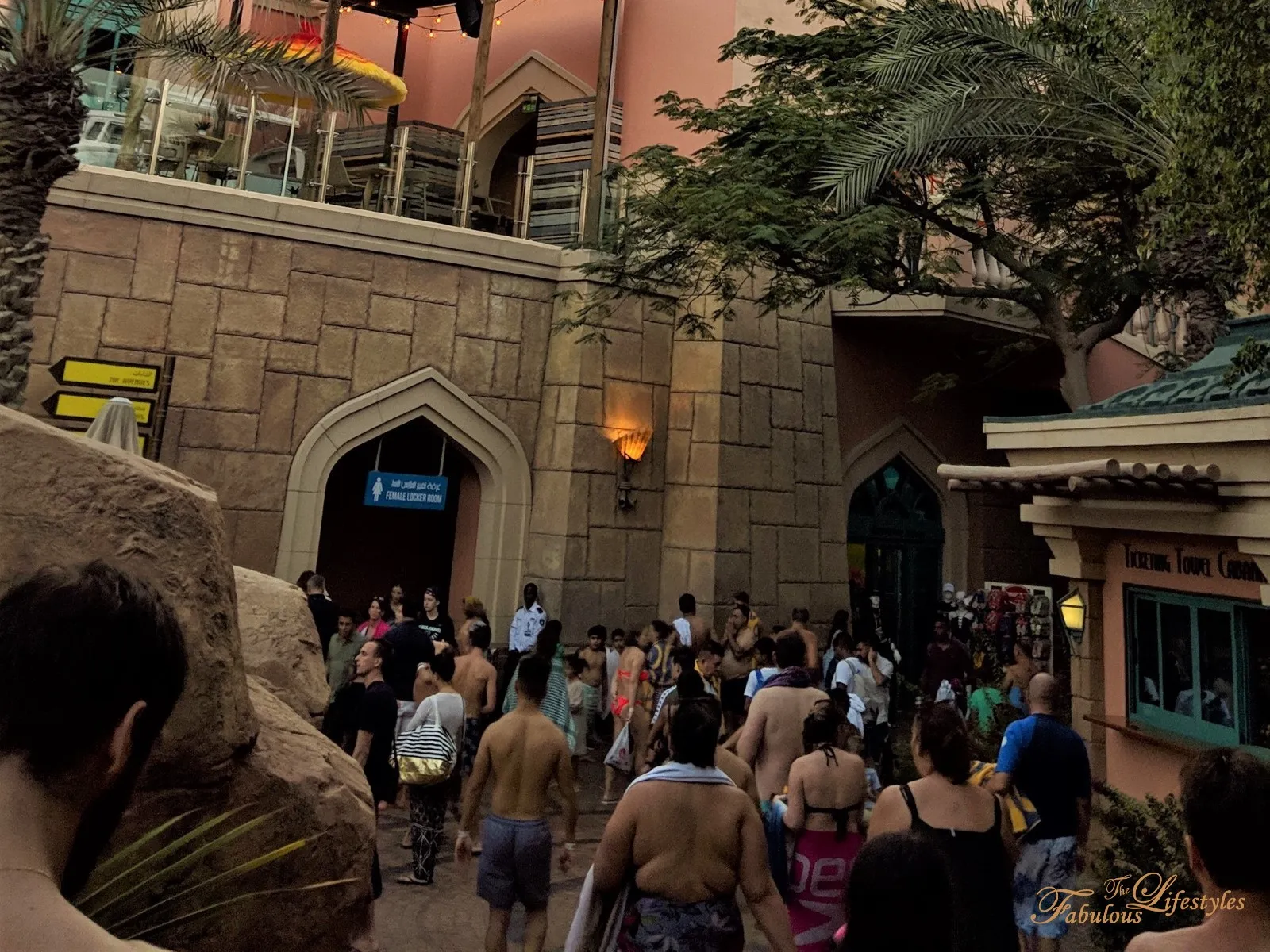 Right after entering the ticket gates, you'll clearly see the changing rooms on your left. Next to the changing rooms is a counter (bottom right of the photo below) where you can rent towels and lockers.