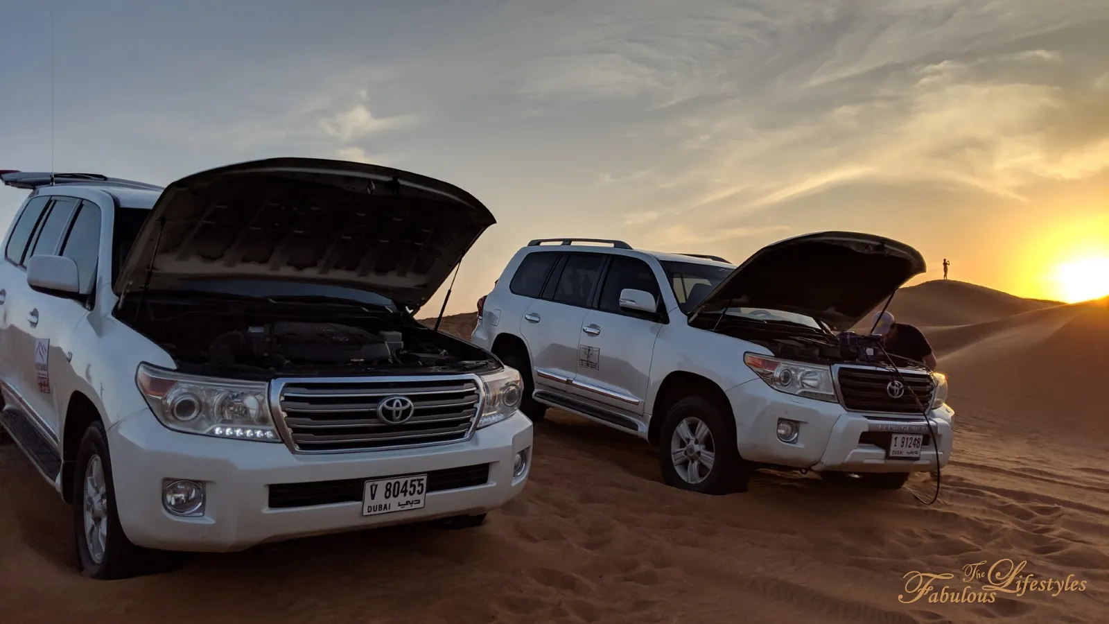 At 3:00 PM, a dedicated driver picked us up from our hotel. As soon as we got in, we noticed the car was heavily modified—the roll bars were completely wrapped in thick crash pads! Yep, this was the exact 4x4 we'd be taking directly into the dunes for the safari, specially padded to protect passengers from getting bumped around.