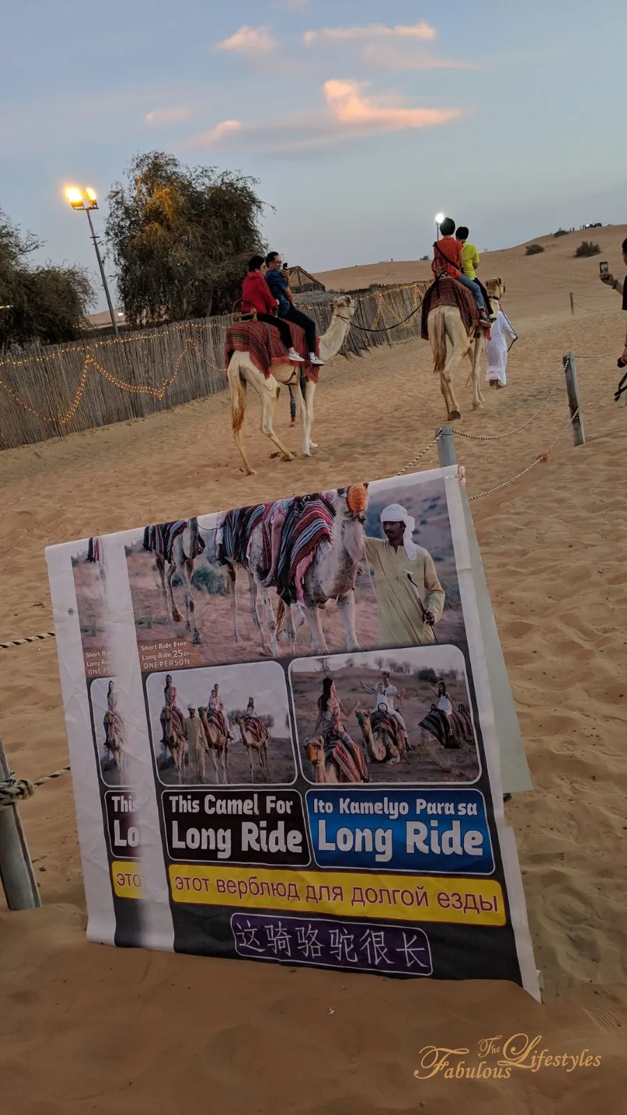 The Chinese translation on the billboard below is a bit weird, but the gist of it was that the free camel ride is a mere 100 meters long—you're done in less than two minutes round trip! The sign was advertising their paid "15-minute camel ride" upgrade for AED 30 per person.