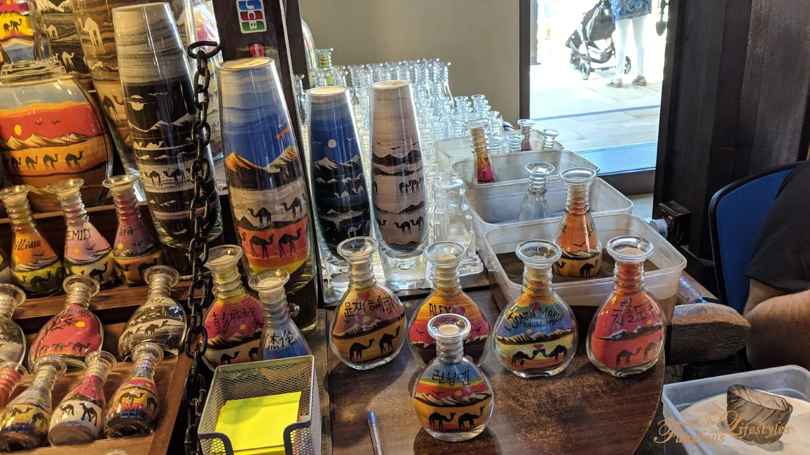 They have those classic camel sand art bottles tailored for tourists. As long as you have the money $_$, they can write your name in English, Chinese, Korean, or whatever language you want~~~😆