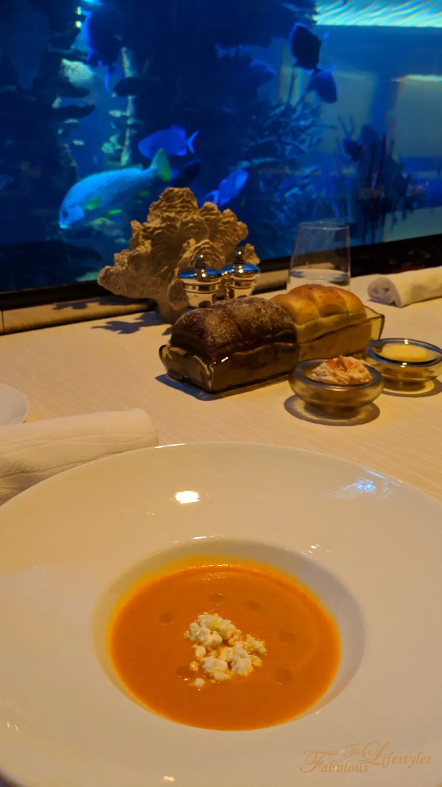 The underwater restaurant offers two types of menus. The 5-course Tasting Menu is priced at AED 990 per person. The other option is à la carte, with main courses starting at AED 360. Please check the official website for the most up-to-date pricing. Note that there is a minimum spend requirement—every guest must order at least one main course!