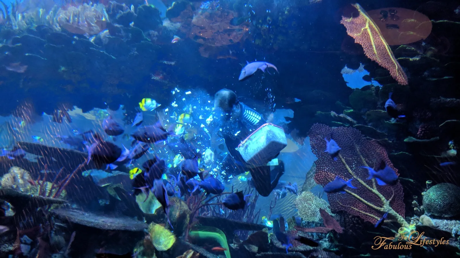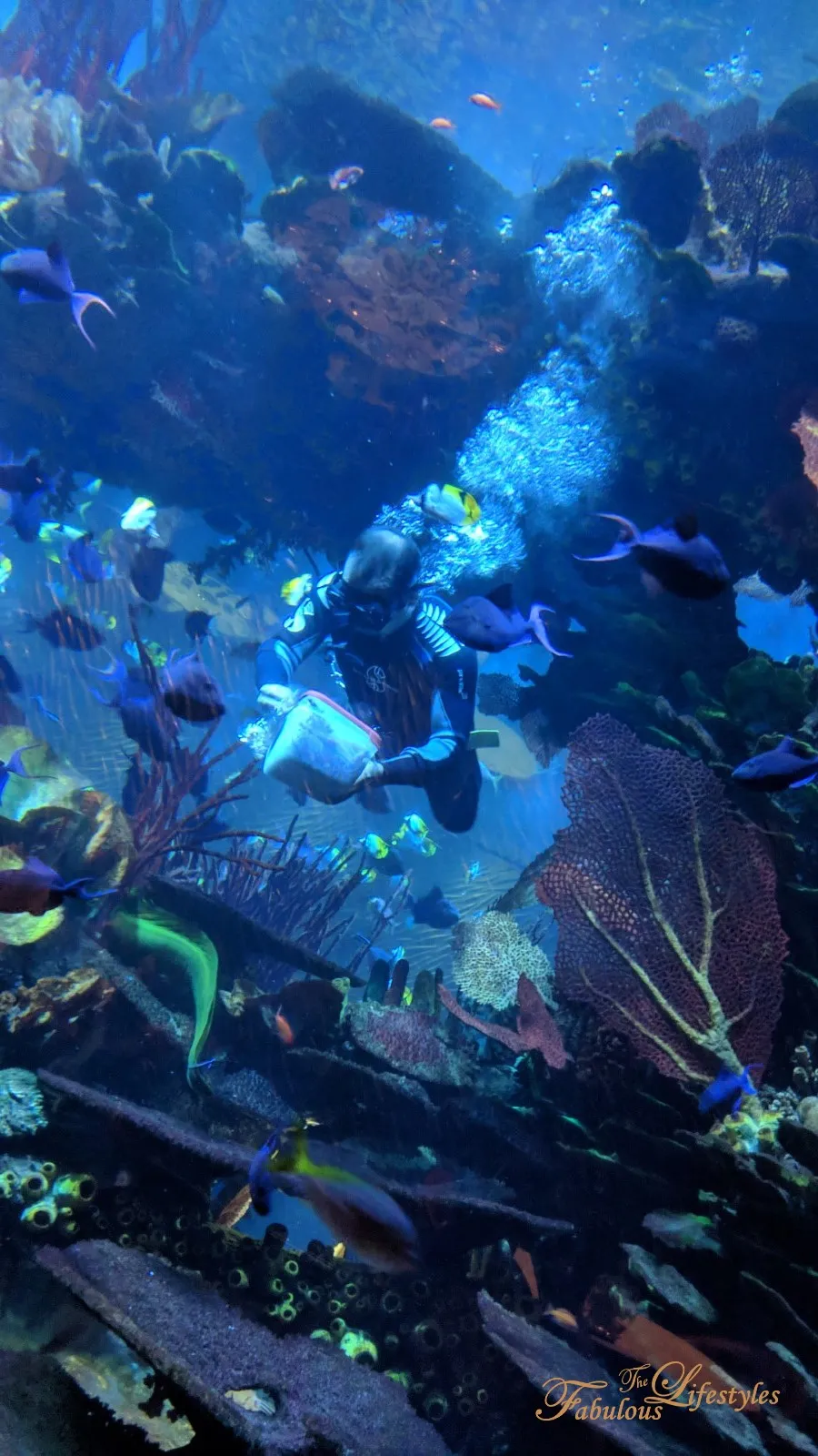 The staff told us that every day around 2:30–3:00 PM, a diver goes into the aquarium to feed the fish. And sure enough… there they were!!!