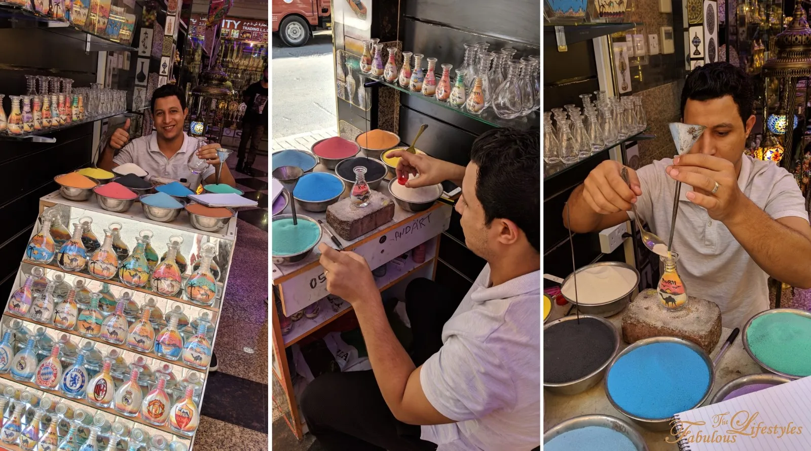 You can also find these must-buy Dubai sand art bottles at the Spice Souk~ We didn't haggle too much for the sand bottle—we bought a small one, which included getting a name written inside, for AED 25! However, we had a really delightful chat with the vendor, a big brother from Egypt! He told us that you could get the exact same sand bottle in Egypt for only AED 5!