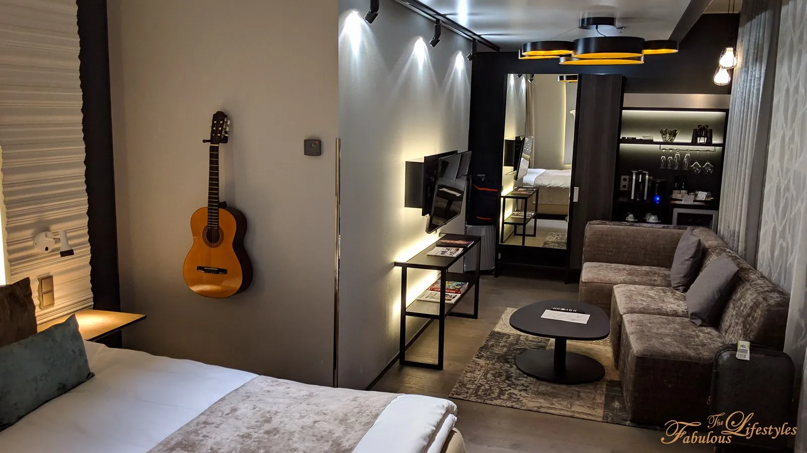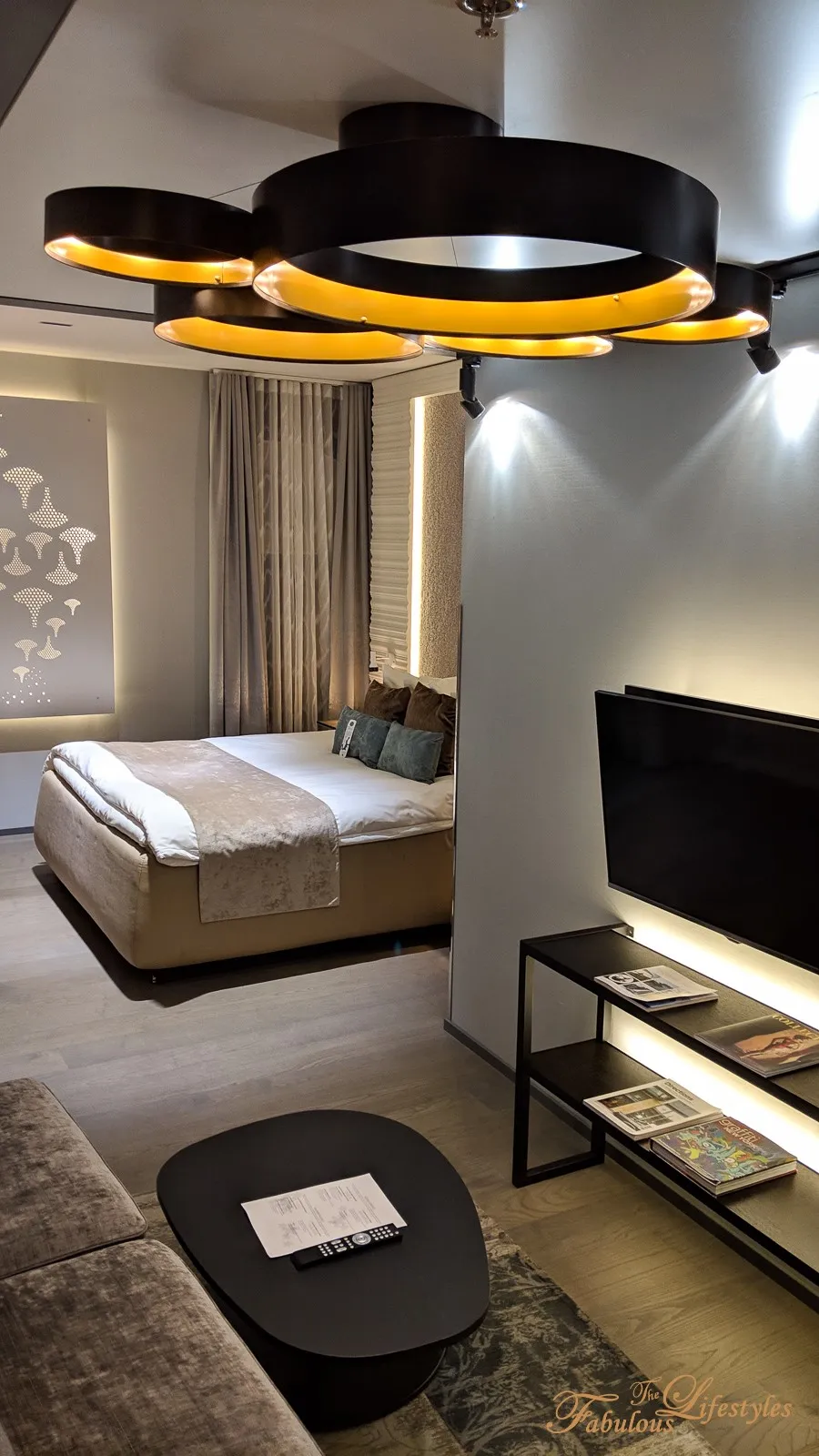 The living area furniture — TV console, coffee table, ceiling light fixtures — all diverged from what you'd expect from a standard hotel. Very Nordic. We half-expected to see IKEA price tags 😄