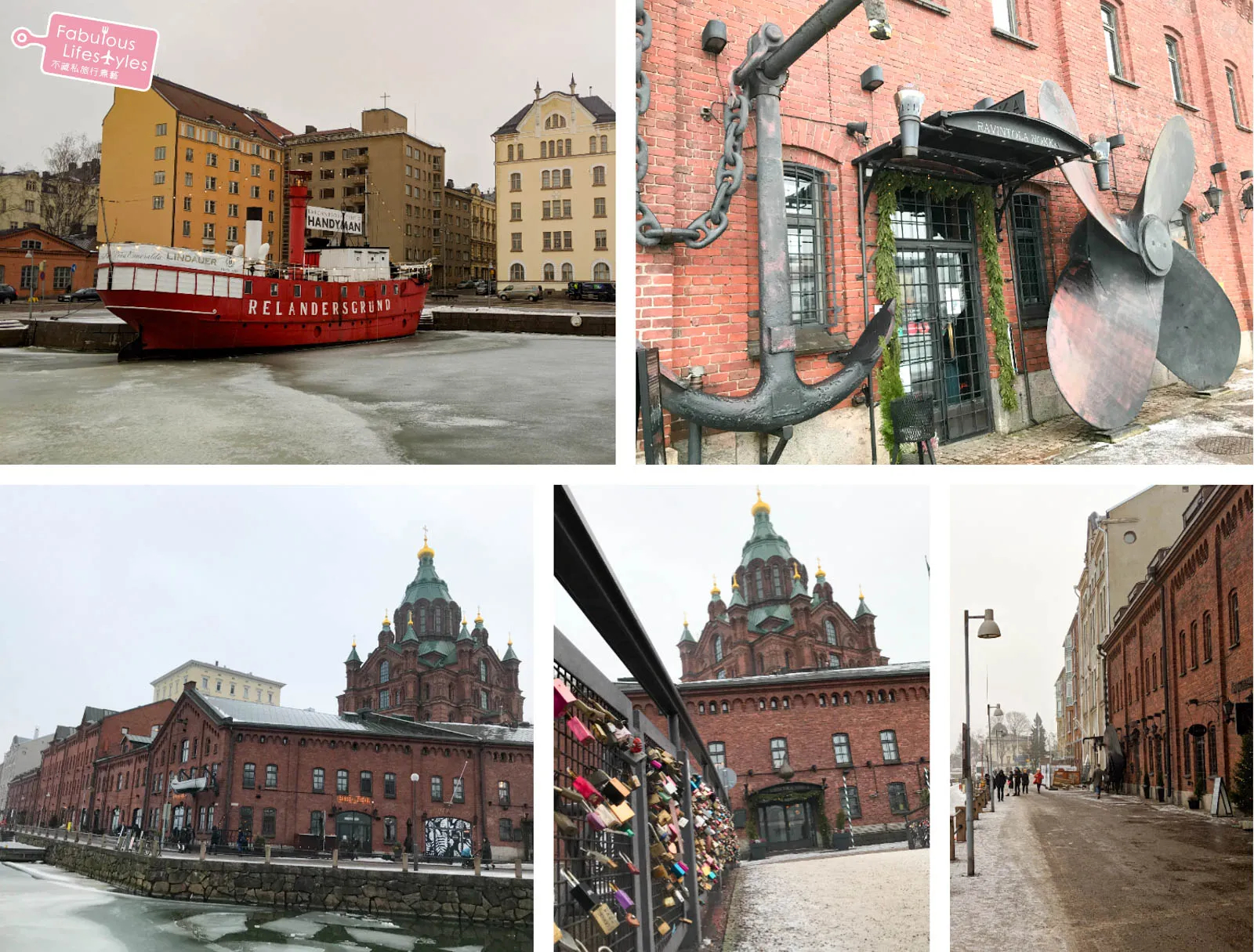 As you walk from Helsinki Cathedral to Uspenski Cathedral, you'll pass by the North Harbour. A striking red ship docked at the shore might catch your eye—it's actually a lovely cafe called Relandersgrund Cafe! Also at the harbor is a highly-rated Finnish restaurant, Ravintola Nokka, featuring a massive propeller and anchor outside, which is super unique! While this side of the harbor might not have the biggest tourist attractions, the row of European-style buildings along the shore is gorgeous. There's also a Love Lock Bridge at the foot of the hill leading to Uspenski Cathedral. Definitely take a moment to admire the views as you pass by!