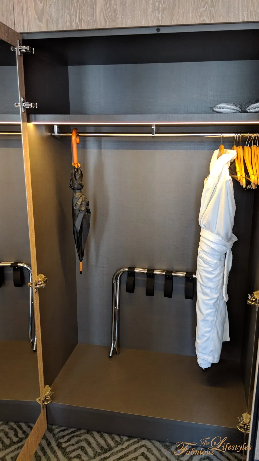 Inside the wardrobe, you'll find slippers, bathrobes, and an umbrella—specially provided for London's ever-changing weather.