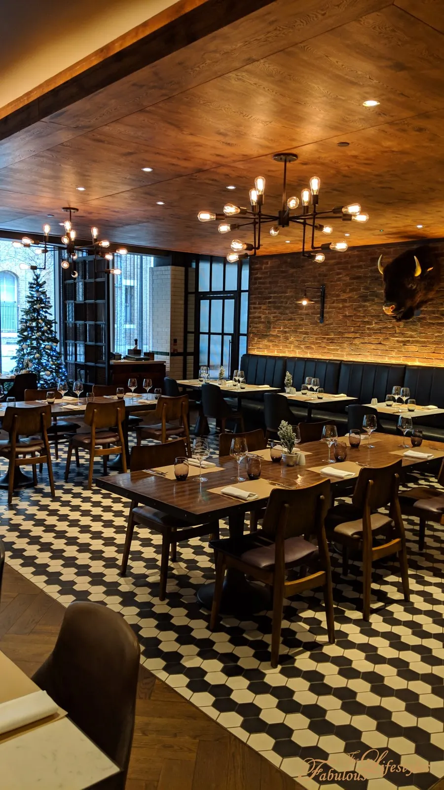 The interior of the restaurant is full of a cozy cabin vibe, making you feel as though you've stepped into a woodland lodge. Because it was Christmas, every table was decorated with a miniature Christmas tree.