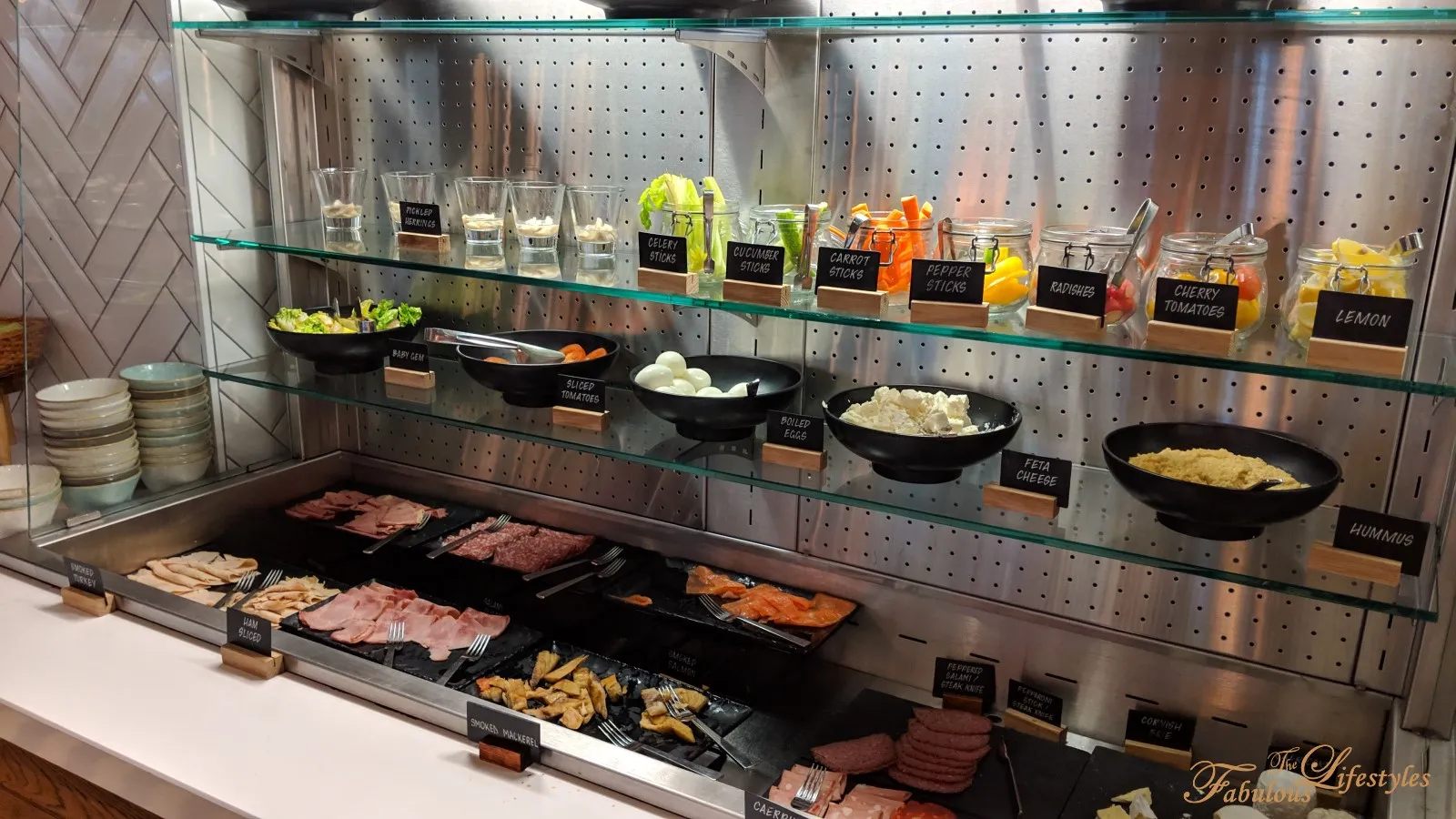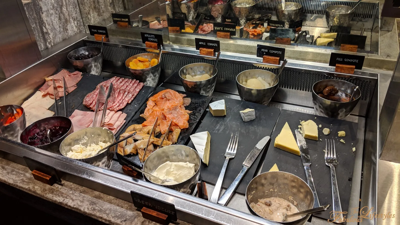 For the cold cuts section, you'll find smoked salmon, various types of bacon and cheeses, and a salad bar.