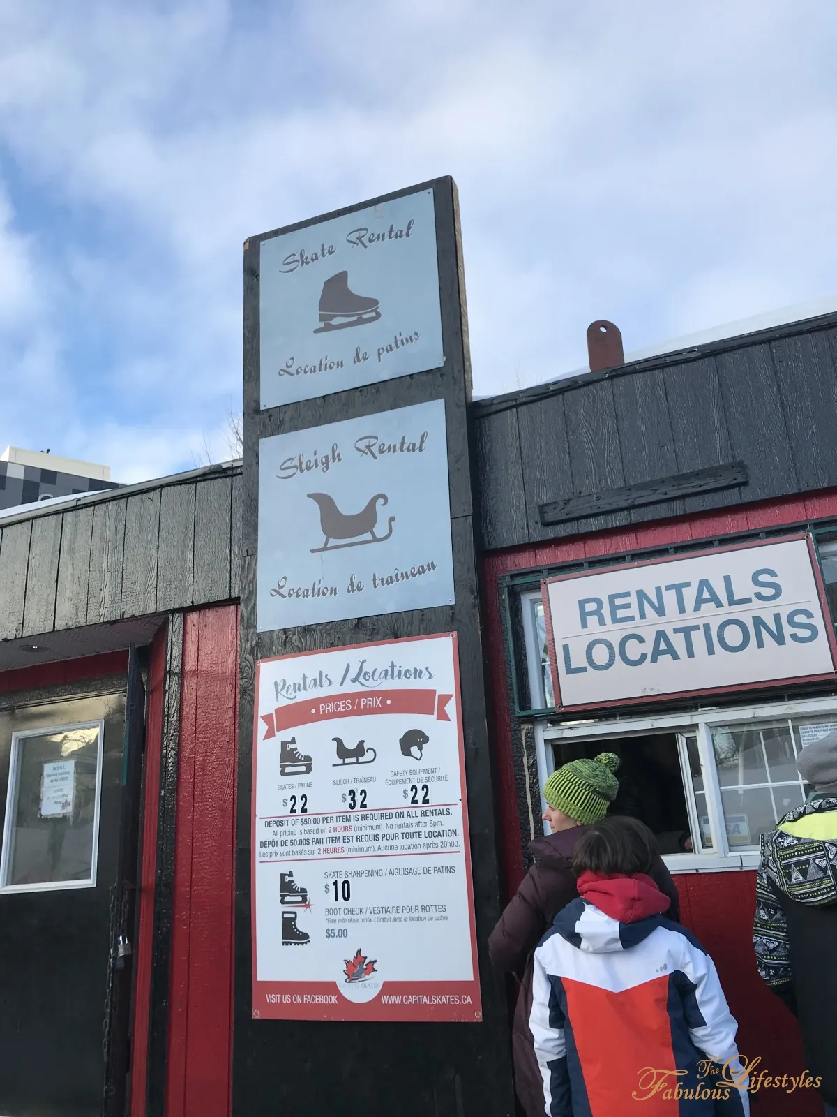 Equipment rentals require a minimum of two hours. For a two-hour session, ice skates are CAD$22, a sled is CAD$32, and a helmet is CAD$22.