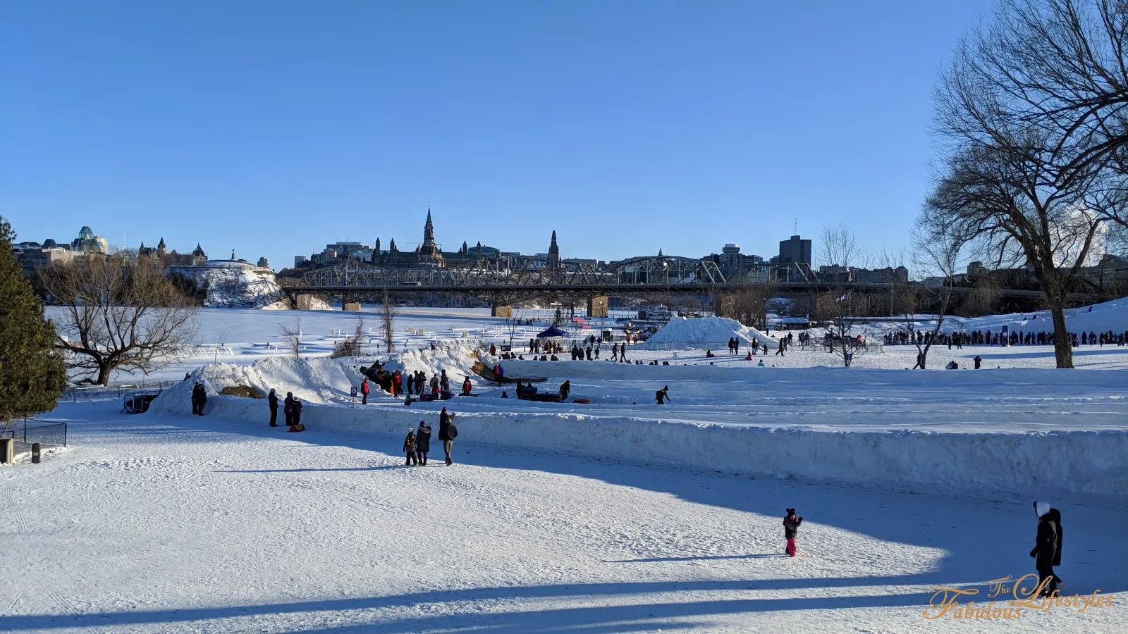 Behind the snow slides, you can even catch a glimpse of Ottawa's famous landmark right across the river—Parliament Hill.