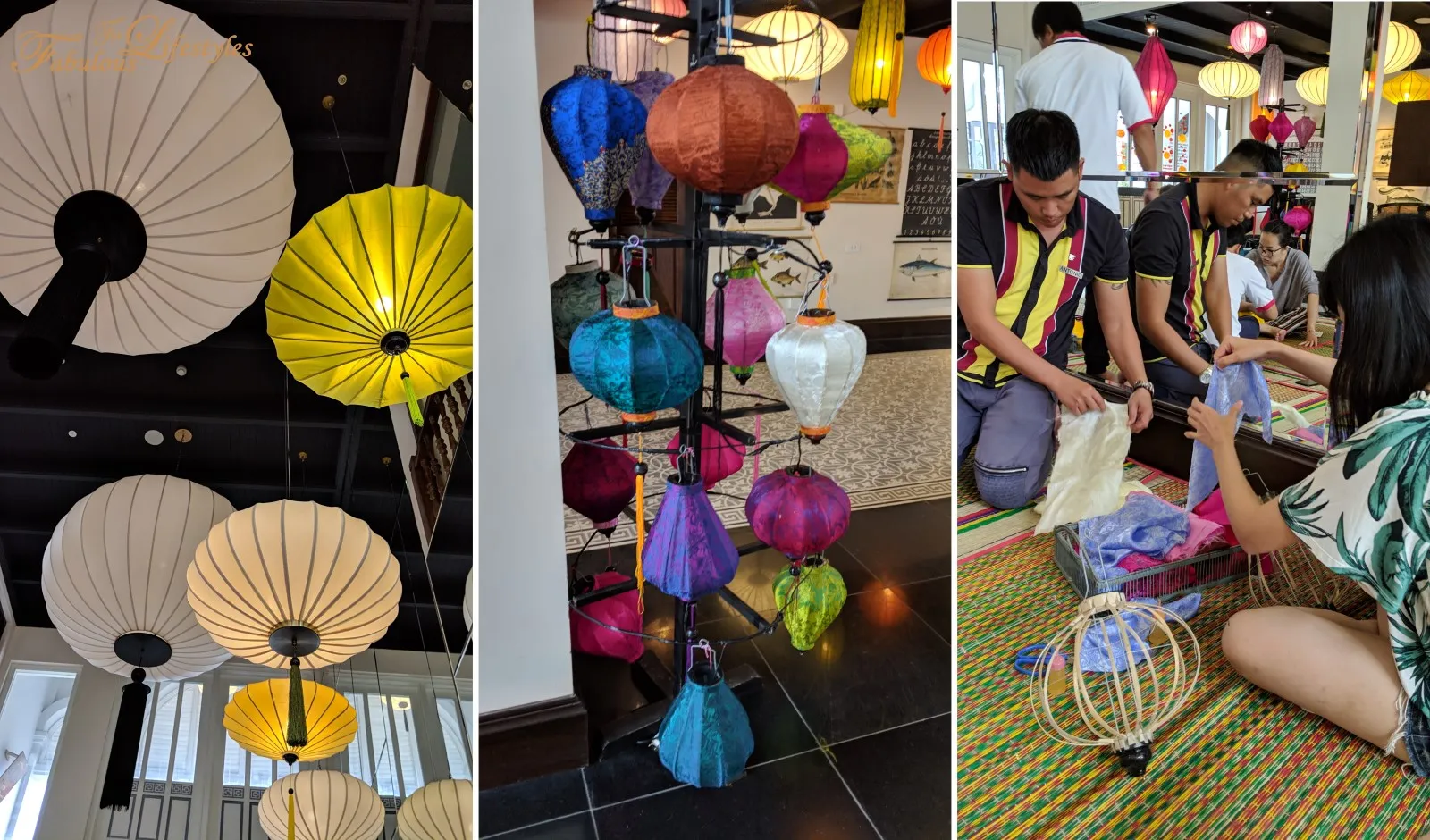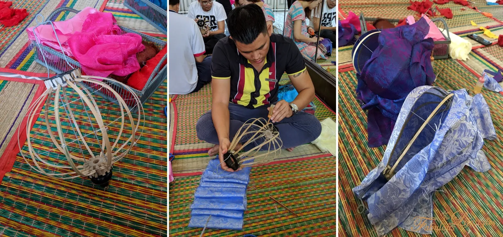 In the lantern-making class, the hotel staff first brings out a vibrant selection of fabrics for us to choose from. You mainly need to pick the primary color for the lantern itself and the color for the upper and lower trimming borders. There are various completed lanterns hanging nearby if you need some inspiration!