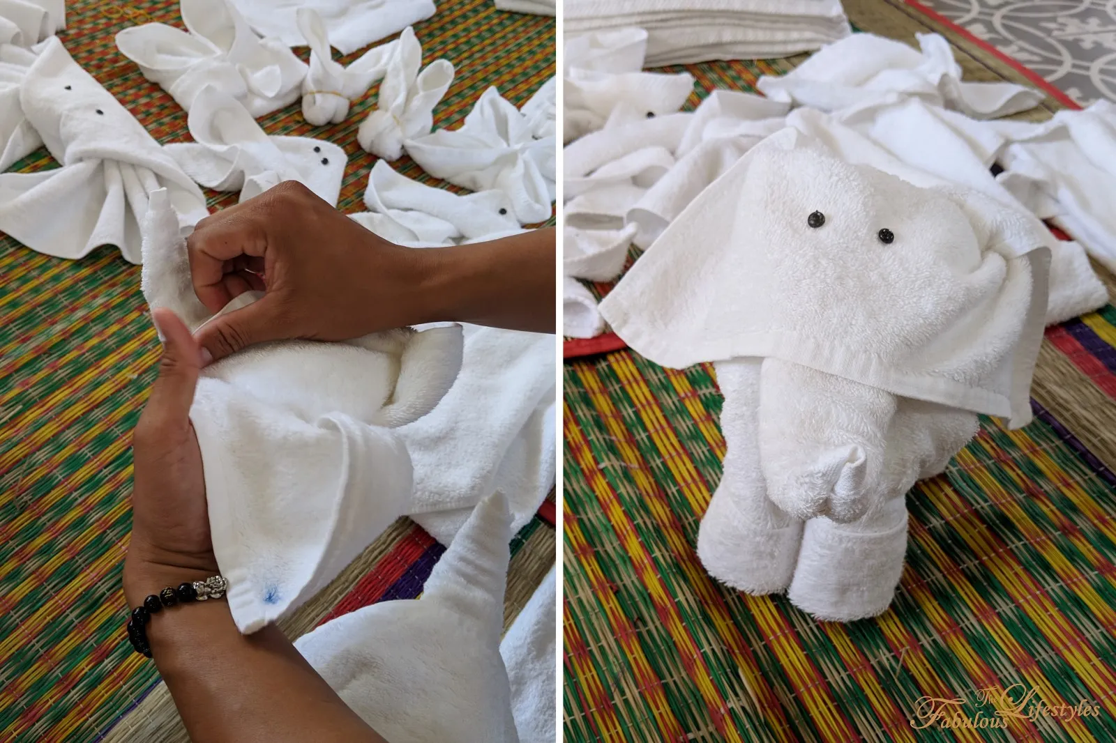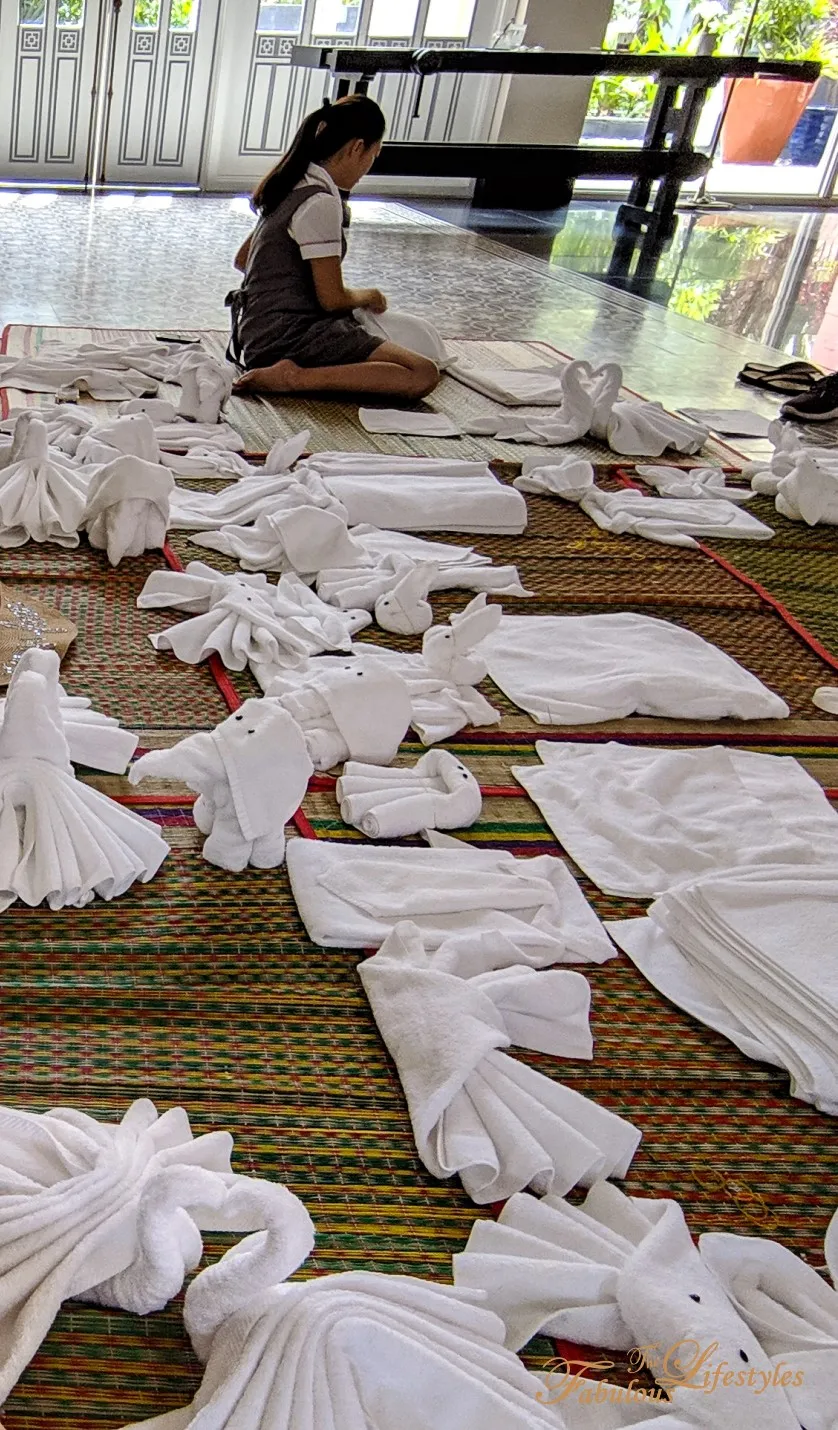 The hotel staff carefully prepared a huge pile of towels of all sizes in the center of the woven mats. There are three different towel sizes used. All the participants sit in a circle as the staff demonstrates step-by-step how to fold various animals, and then it's our turn to practice!