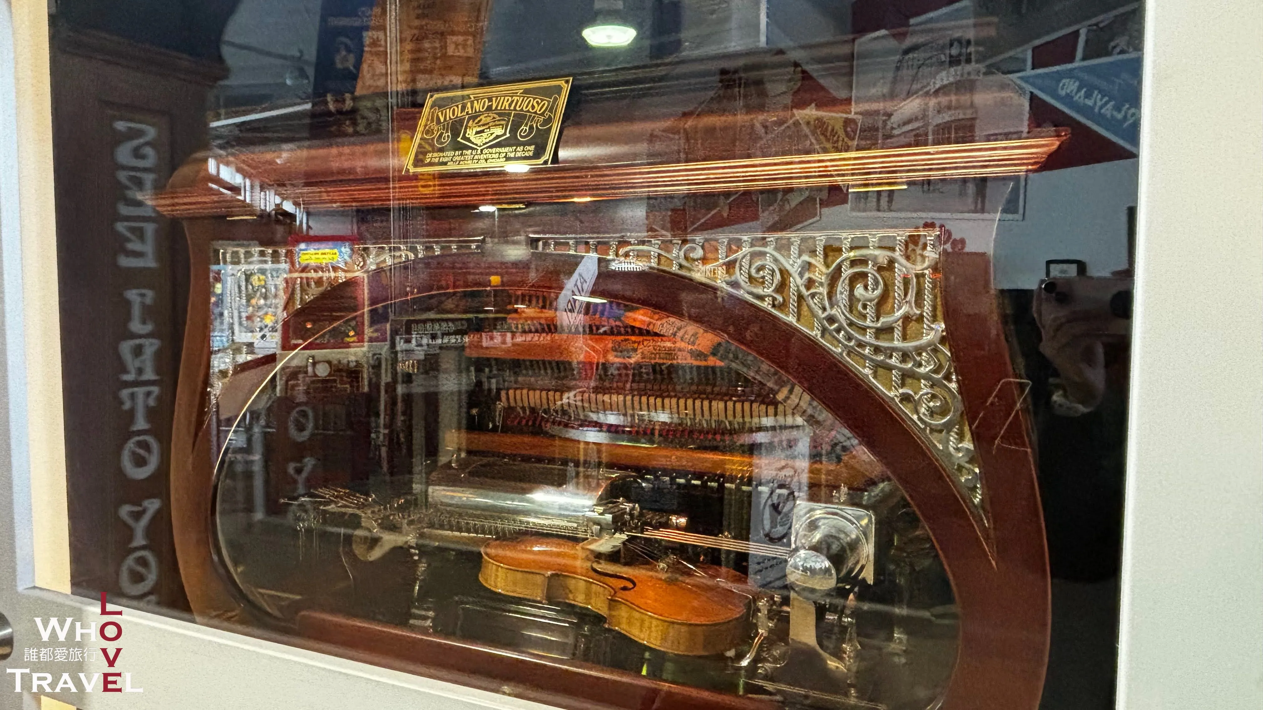Besides the player pianos, we also found a super cool automatic violin machine. This one is quite a bit more expensive—it costs five dollars for a single performance! Plus, it's locked behind a glass door, which definitely gives it a really precious and exclusive vibe.