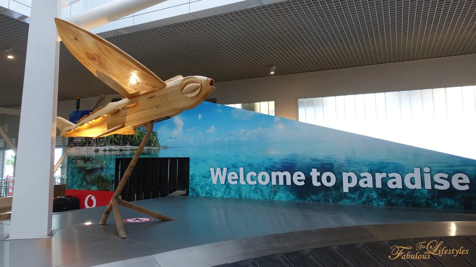 There are even wooden carvings right next to the baggage carousel, welcoming you with "Welcome to paradise"!