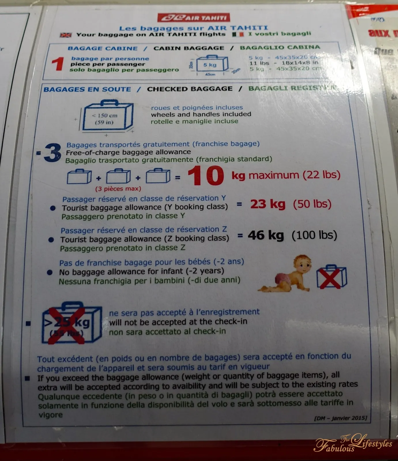 Air Tahiti's carry-on baggage rules are quite strict—it cannot exceed 5 kg. If your rolling suitcase can be checked, we highly recommend checking it in. However, that day we only had one backpack on us, and they didn't ask us to weigh it. Checked baggage allowances also vary depending on your ticket class. You can see the specific carry-on and checked luggage rules in the image below: