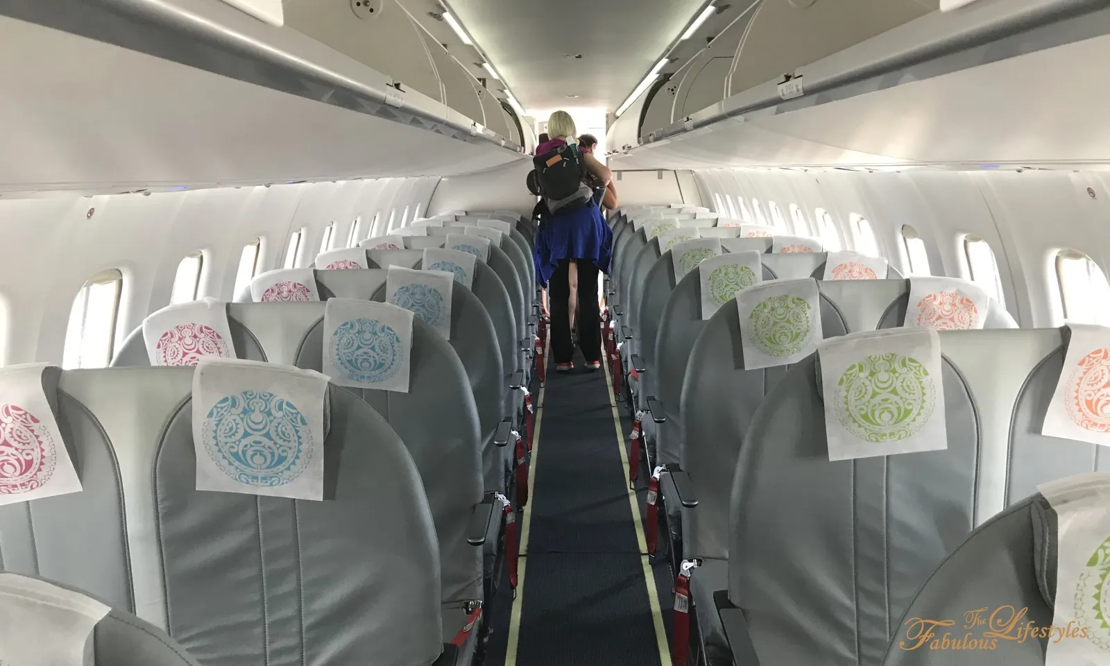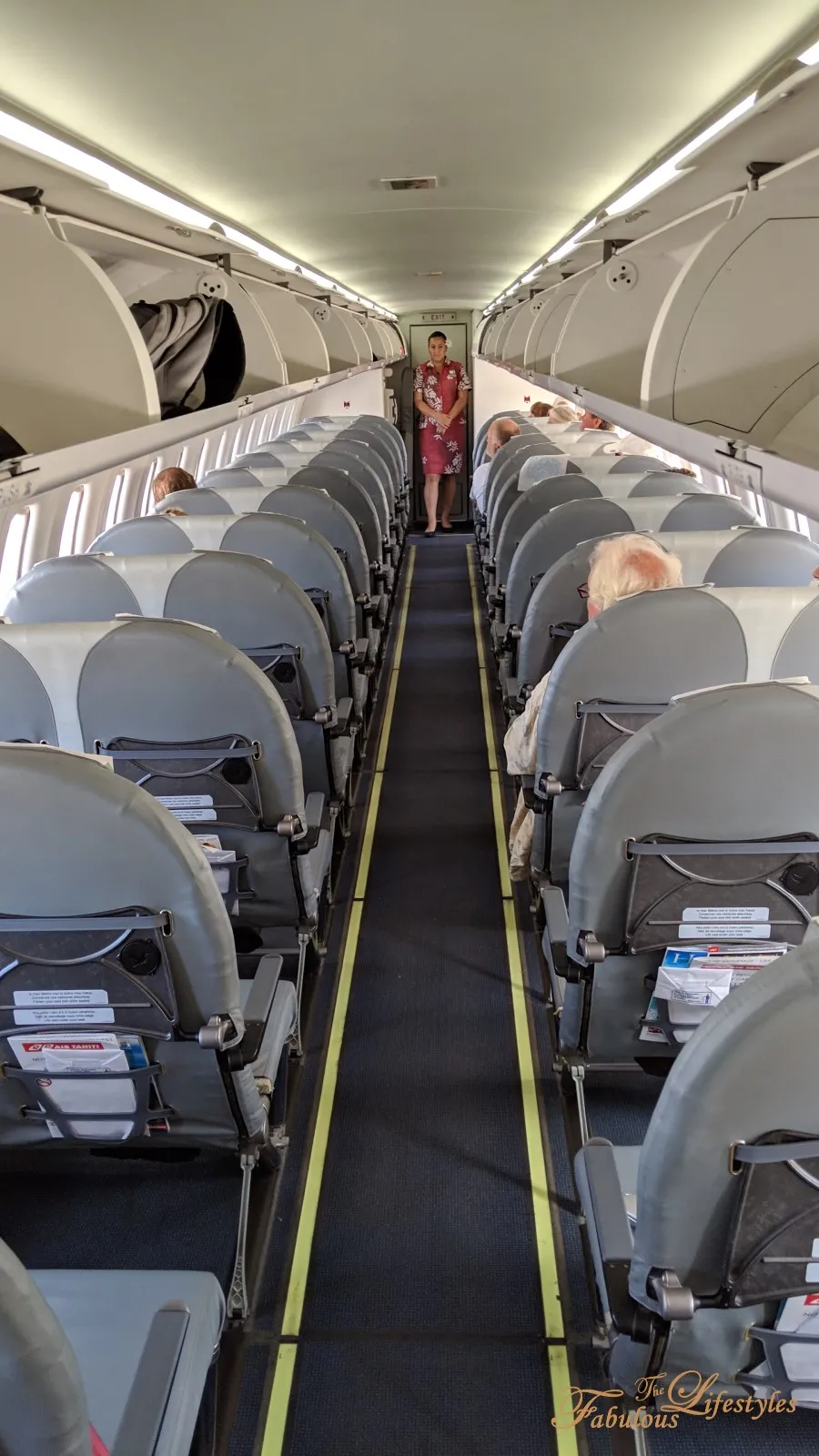 A look inside the cabin. The flight attendants wear island-style floral dresses with a flower tucked behind their ears. It perfectly matches the word "Tahiti" I had pictured in my mind, literally written all over their uniforms!