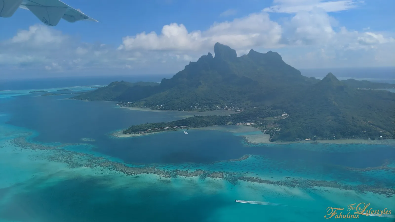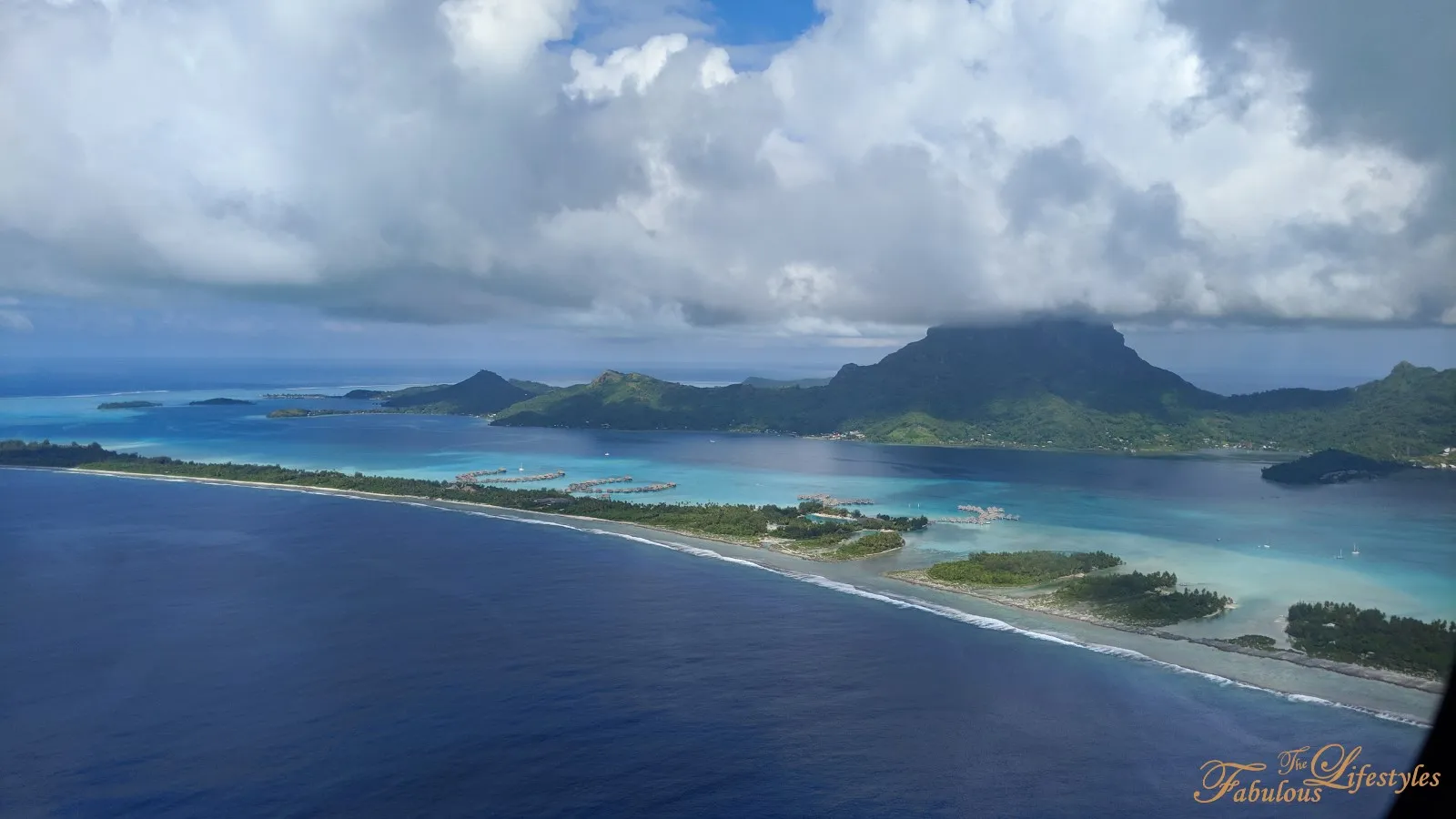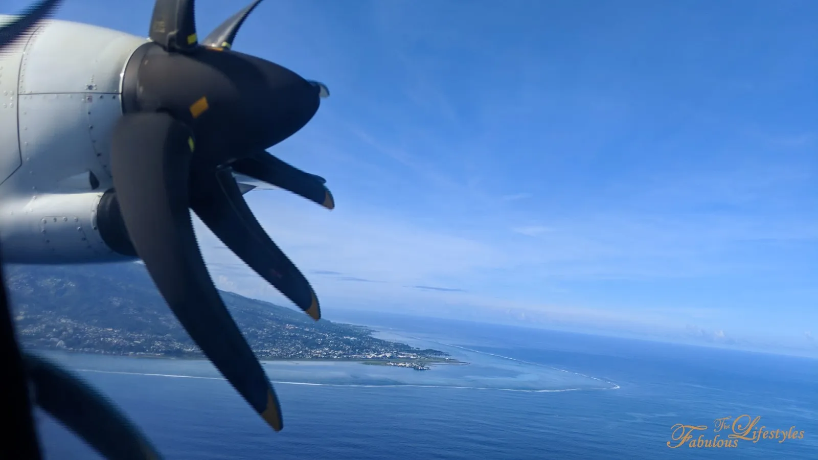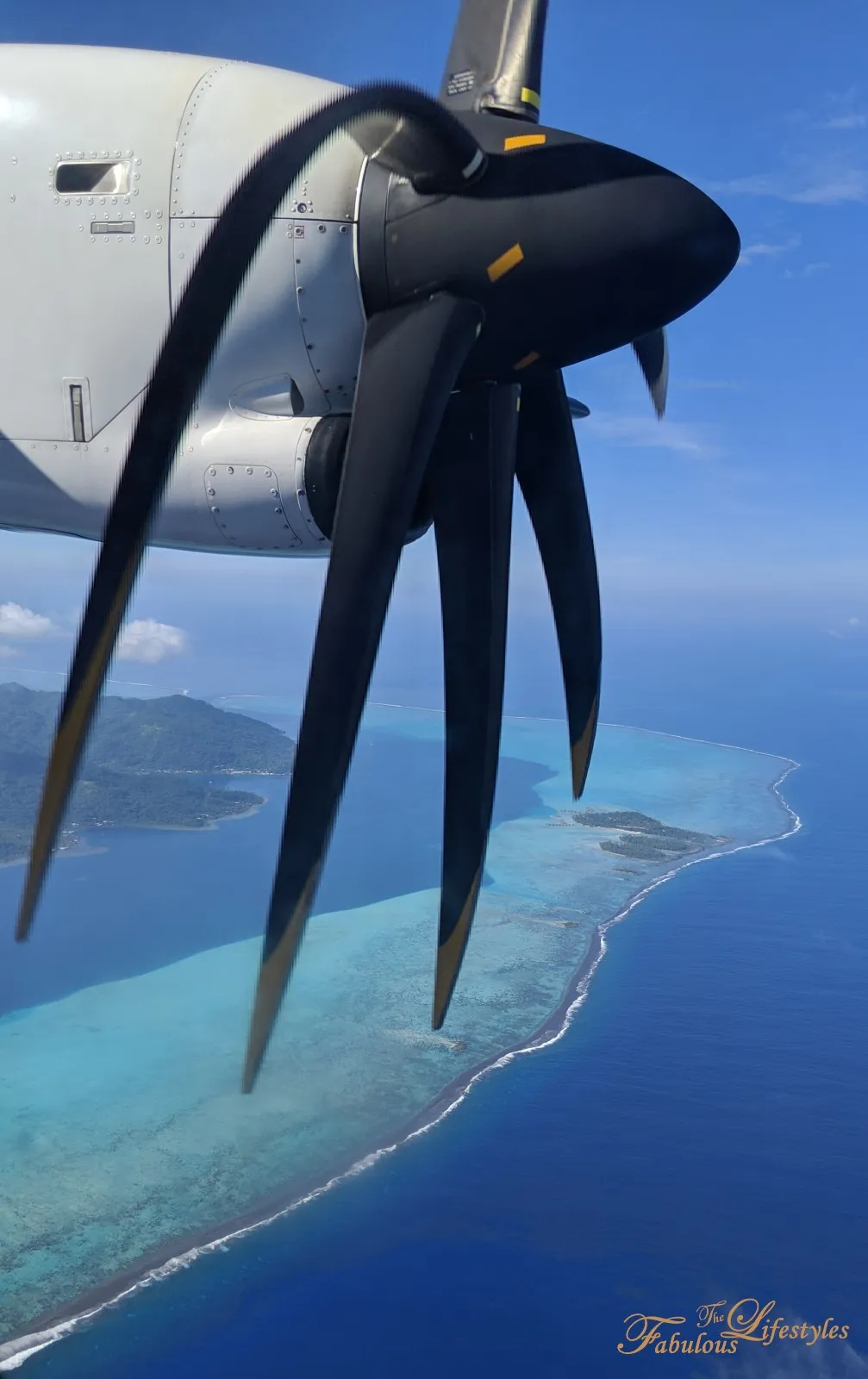 Important Tip! If you're flying Air Tahiti to Bora Bora, remember to sit in the front left or rear left seats. The view from the middle seats will be blocked by the wings. Cherry's personal favorite is the front left seat! Not only is the view out the window unobstructed by the wing, but you can also see the spinning propellers. It seemed like it had rained before our departure, and I'm not sure if it was because of that rain (maybe it washed the windows extra clean?), but the views during takeoff that day felt exceptionally crystal clear.