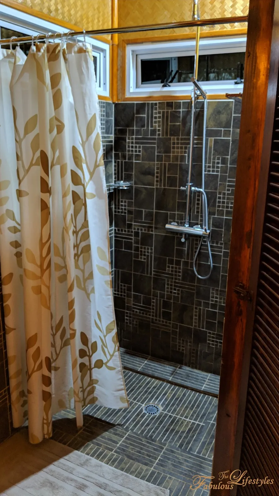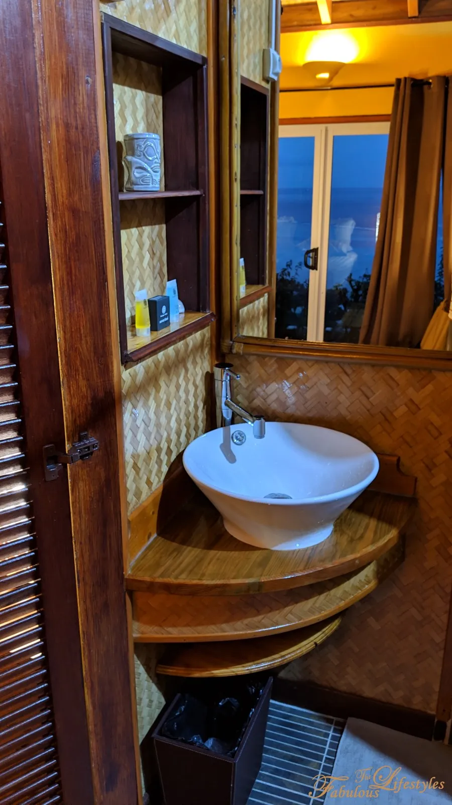 The bathroom has a wonderfully unique design — the ceiling, like the room, is made of woven bamboo, and the shower area features two ventilation windows. Small but oh-so-elegant.