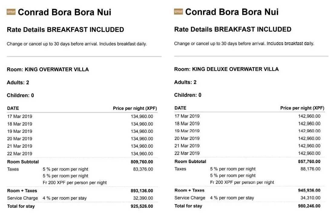 If we hadn’t read online about experienced travelers using points to book a room at the Conrad Bora Bora Nui and then paying to upgrade, Cherry and Fish wouldn't have been able to afford even a single night in an overwater bungalow using real money… For the six nights we stayed, the room rate with breakfast would have been over 900,000 Pacific Francs (around $9,000 USD)!!!!