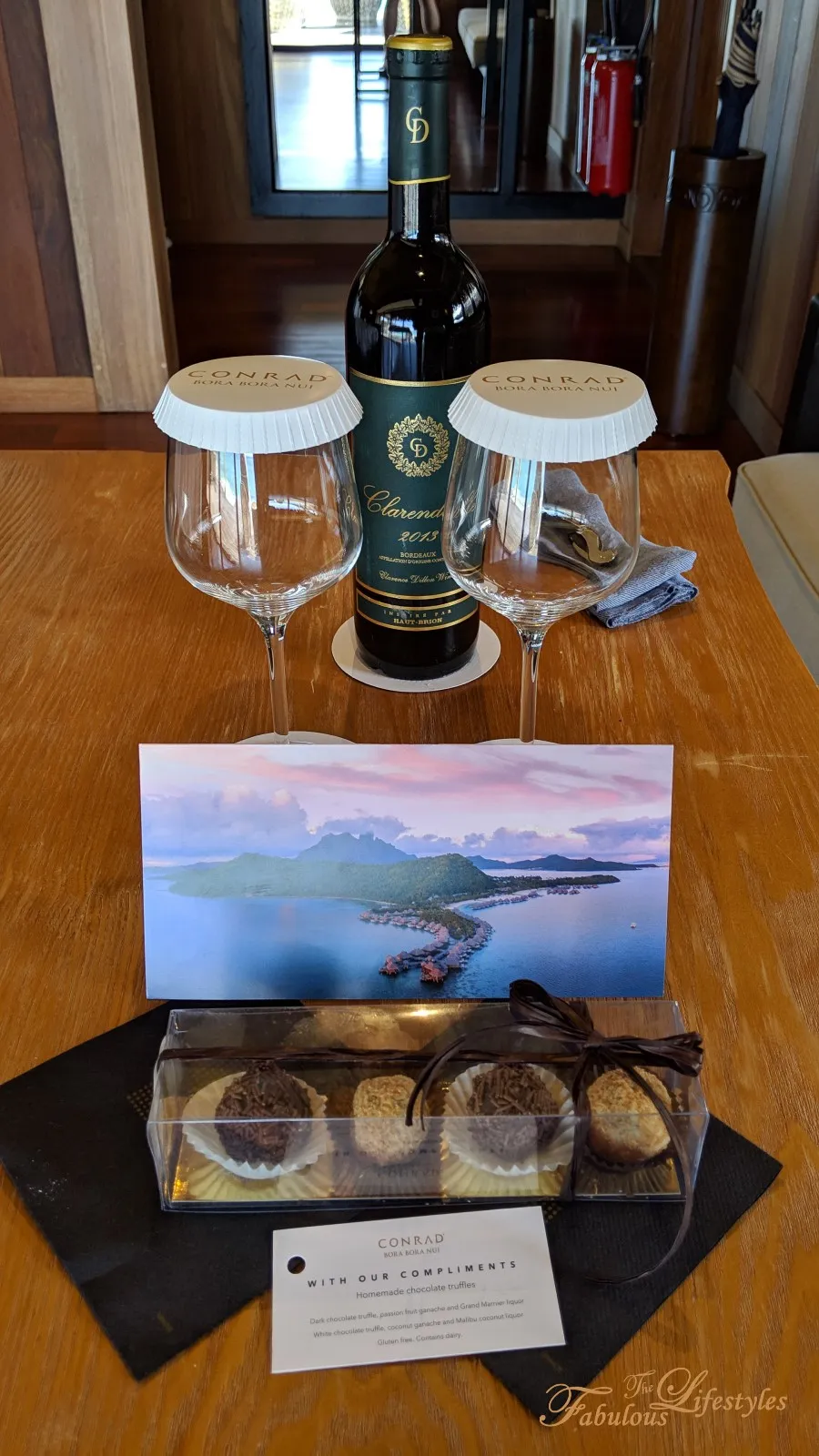 On the coffee table, they had thoughtfully prepared a bottle of red wine, artisan chocolates, and a lovely welcome postcard for us.