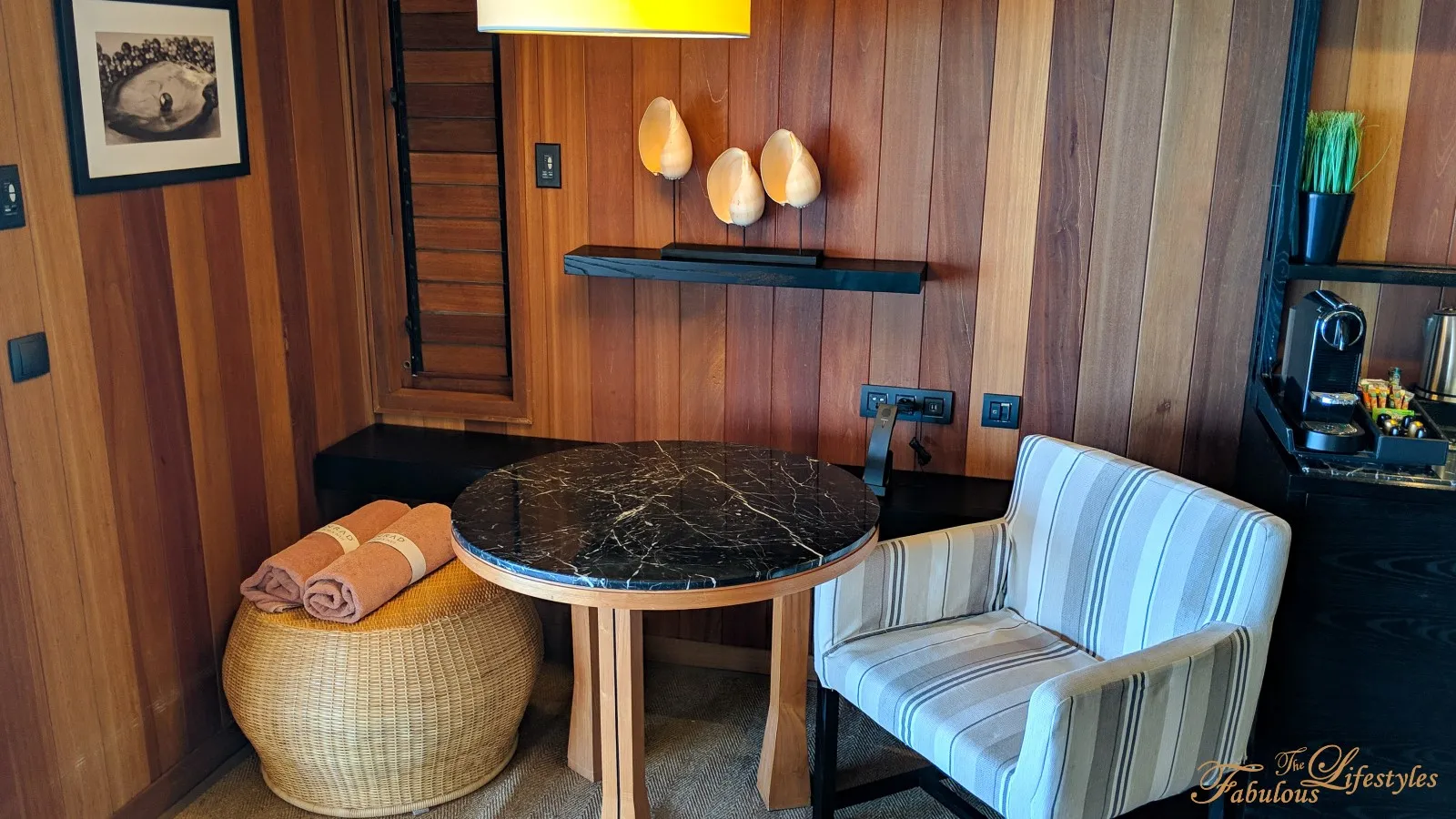 One evening, we actually used this small table to have dinner in the room! The little stool next to it holds resort beach towels, which are perfect for when you want to take a dip~