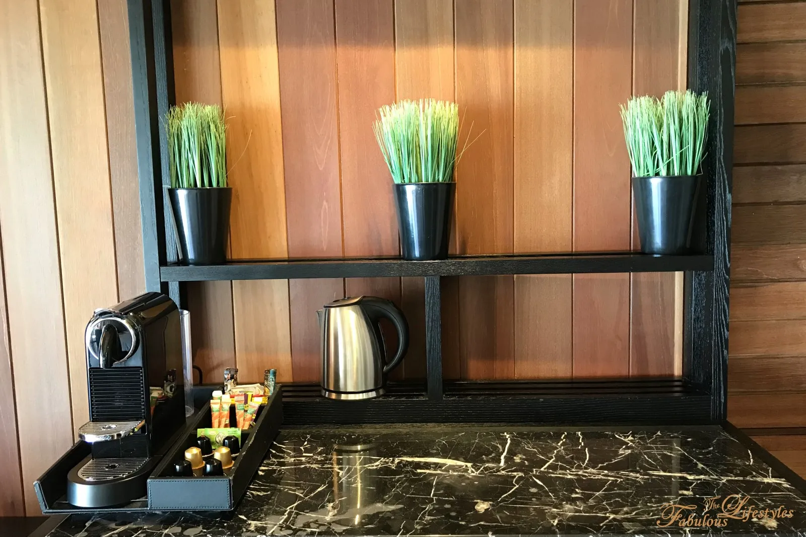The adjacent Mini Bar features an espresso machine, an electric kettle, coffee capsules, tea bags, sugar, and more~