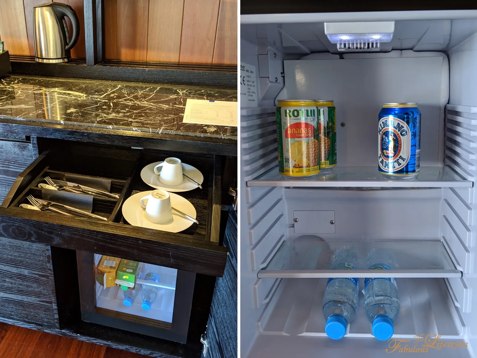 Opening the right side of the cabinet reveals coffee cups, forks, spoons, and other cutlery. In the mini-fridge below, we found two bottles of fresh pineapple juice from Moorea, two bottles of local Tahiti beer, and two bottles of water~