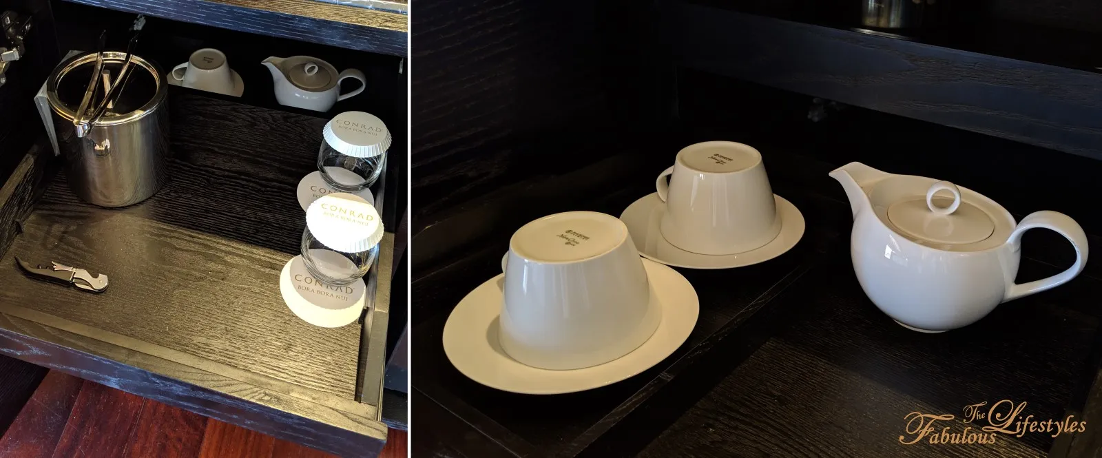 On the left side, there's an ice bucket, teacups, and a bottle opener. You can take the ice bucket to the nearby ice machine whenever you need a refill. There's also a full teapot set if you're in the mood for tea—super convenient!